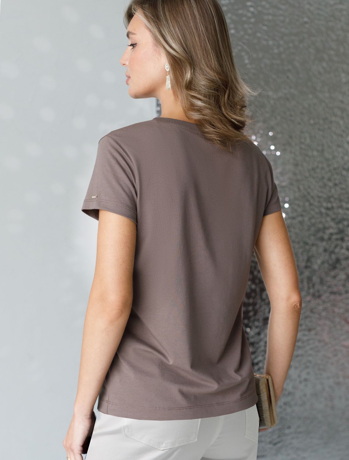 Стильная базовая футболка кофейного цвета с серебристым принтом фольгой выполнена из плотного хлопка с эластаном для комфортной посадки на любую фигуру. Прямая футболка классического кроя с круглым вырезом, прекрасно подходит для разных типов фигуры, в том числе и на большие размеры. Мягкость хлопка вместе с небольшой долей эластана гарантирует идеальную посадку и свободу движений. Легкая натуральная дышащая ткань премиального качества делает футболку с коротким рукавом идеальным вариантом для повседневной носки дома, на работу или офис. Однотонная футболка дополнена авторским аккуратным принтом с изображением леопарда, который придает праздничный и элегантный вид без лишней вычурности. Блестящий анималистичный принт аккуратно украшает, добавляя изысканный акцент и создавая легкий мерцающий эффект.