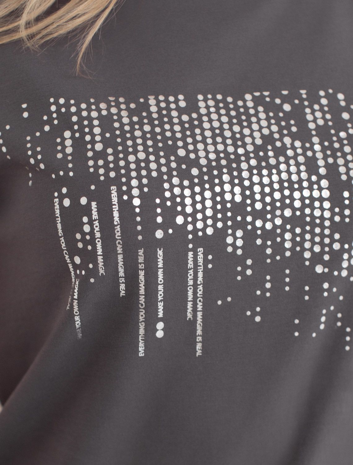 Стильная базовая футболка темно-серого цвета с серебристым принтом устойчивами красками выполнена из плотного хлопка с эластаном для комфортной посадки на любую фигуру. Прямая футболка классического кроя с круглым вырезом, прекрасно подходит для разных типов фигуры, в том числе и на большие размеры. Мягкость хлопка вместе с небольшой долей эластана гарантирует идеальную посадку и свободу движений. Легкая натуральная дышащая ткань премиального качества делает футболку с коротким рукавом идеальным вариантом для повседневной носки дома, на работу или офис. Однотонная футболка дополнена авторским аккуратным принтом, который придает праздничный и элегантный вид без лишней вычурности. Блестящий принт в виде дождика аккуратно украшает, добавляя изысканный акцент и создавая легкий мерцающий эффект.