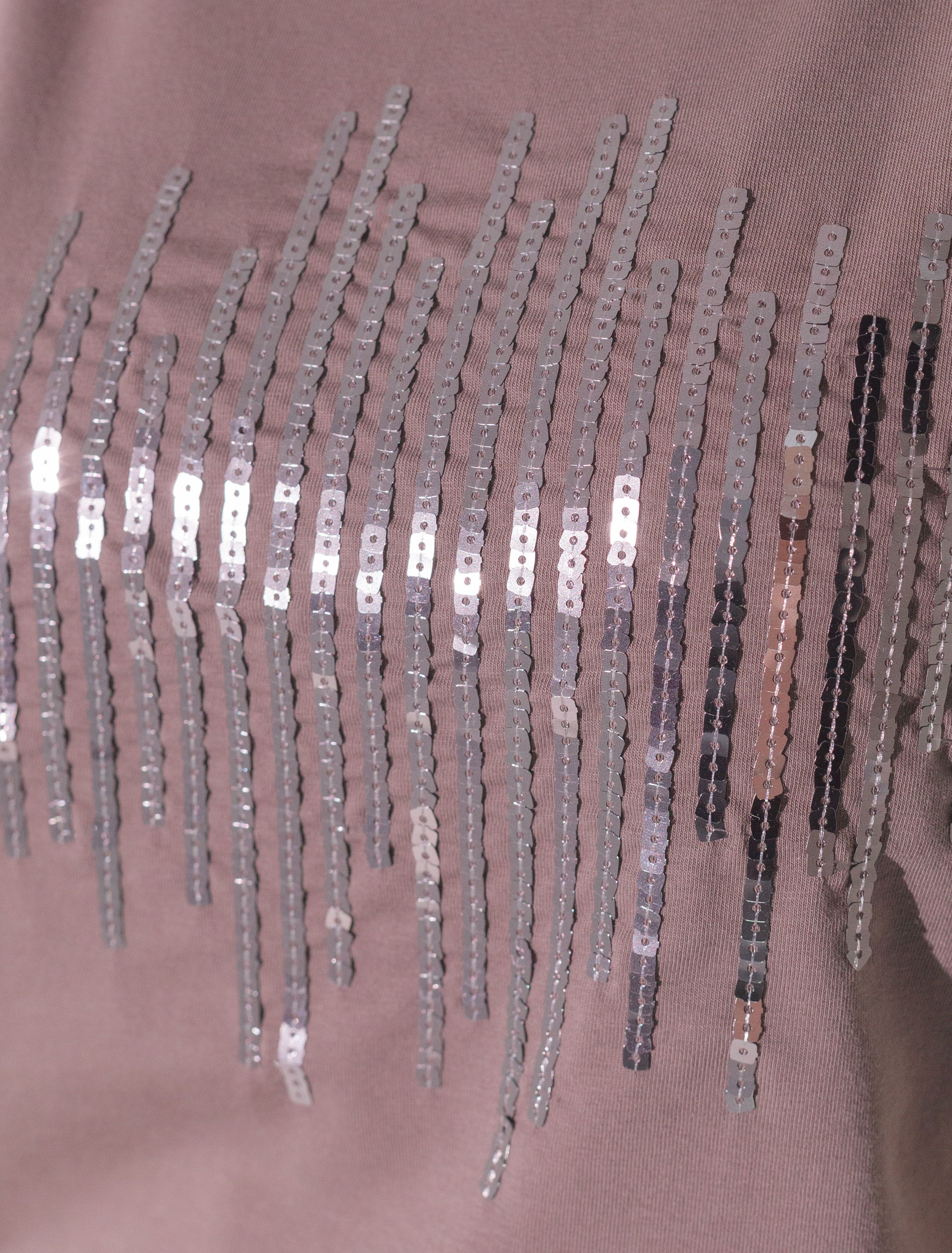 Футболка кофейного цвета идеально подходит для вечеринки и создания яркого образа. Оригинальный принт из блестящих пайеток в виде дождика придает изделию шикарный вид, который привлечет внимание на любом мероприятии. Модель с вырезом лодочка и цельнокроеным рукавом обеспечивает свободу движений и комфорт в носке. Такой фасон изделия подходит на большие размеры, гармонично сидит на фигуре и помогает создать легкий акцент на достоинствах. Благодаря особенностям кроя с цельнокроеным рукавом удается искусно скроет любые возможные недостатки в области плеч и рук, обеспечивая комфортное прилегание без ощущения скованности. Аккуратный вырез лодочка красиво подчеркивает шею и делает образ элегантным, сохраняя актуальность для разных случаев — от рабочих встреч до вечерних прогулок и праздничных мероприятий.