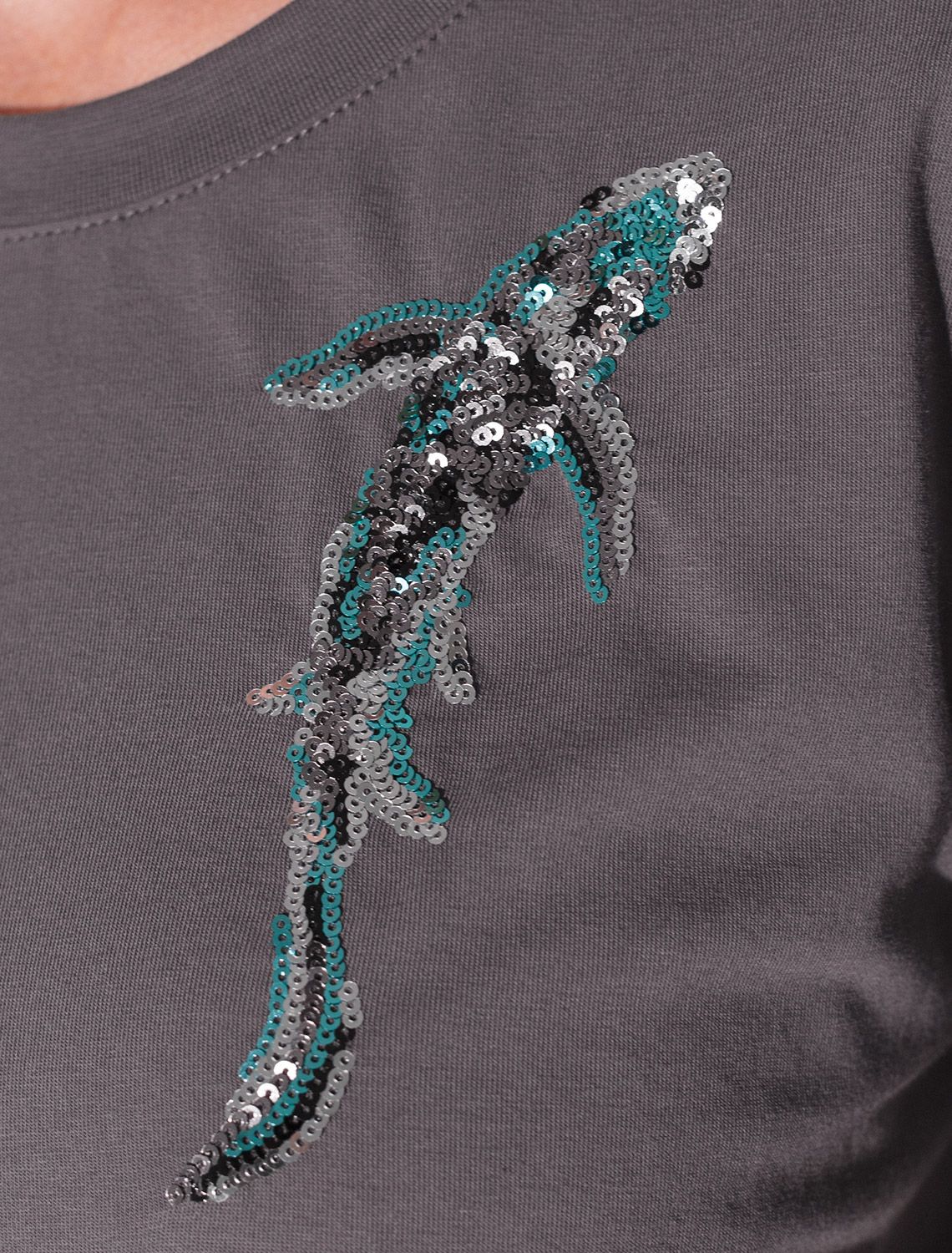 Стильная базовая футболка темно-серого цвета с принтом пайетками в виде рыбки выполнена из плотного хлопка с эластаном для комфортной посадки на любую фигуру. Прямая футболка классического кроя с круглым вырезом, прекрасно подходит для разных типов фигуры, в том числе и на большие размеры. Мягкость хлопка вместе с небольшой долей эластана гарантирует идеальную посадку и свободу движений. Легкая натуральная дышащая ткань премиального качества делает футболку с коротким рукавом идеальным вариантом для повседневной носки дома, на работу или офис. Однотонная футболка дополнена авторским аккуратным принтом зебра, который придает праздничный и элегантный вид без лишней вычурности. Блестящий анималистичный принт аккуратно украшает, добавляя изысканный акцент и создавая легкий мерцающий эффект.
