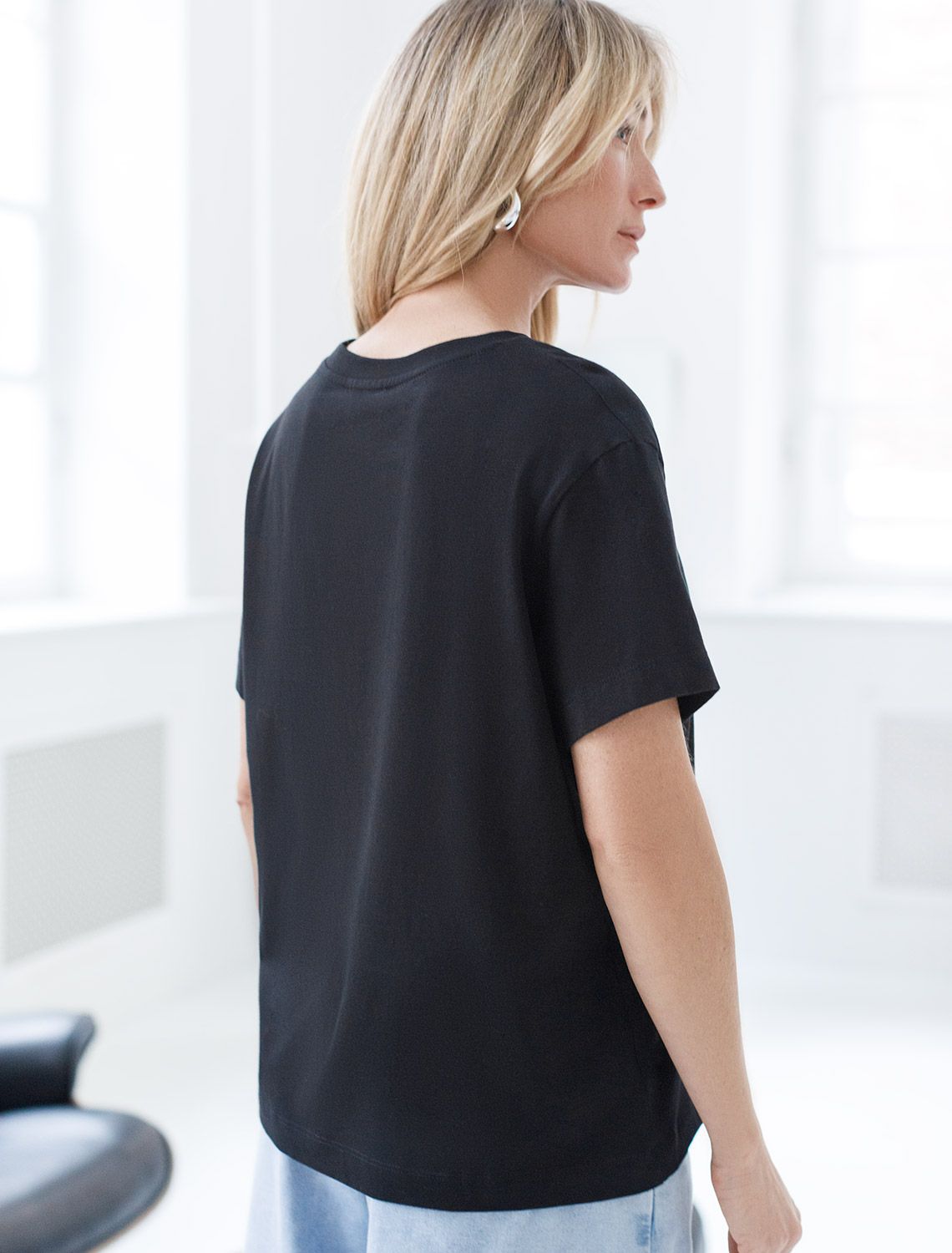 Стильная базовая футболка черного цвета с принтом пайетками в виде рыбки выполнена из плотного хлопка с эластаном для комфортной посадки на любую фигуру. Прямая футболка классического кроя с круглым вырезом, прекрасно подходит для разных типов фигуры, в том числе и на большие размеры. Мягкость хлопка вместе с небольшой долей эластана гарантирует идеальную посадку и свободу движений. Легкая натуральная дышащая ткань премиального качества делает футболку с коротким рукавом идеальным вариантом для повседневной носки дома, на работу или офис. Однотонная футболка дополнена авторским аккуратным принтом, который придает праздничный и элегантный вид без лишней вычурности. Блестящий анималистичный принт аккуратно украшает, добавляя изысканный акцент и создавая легкий мерцающий эффект.