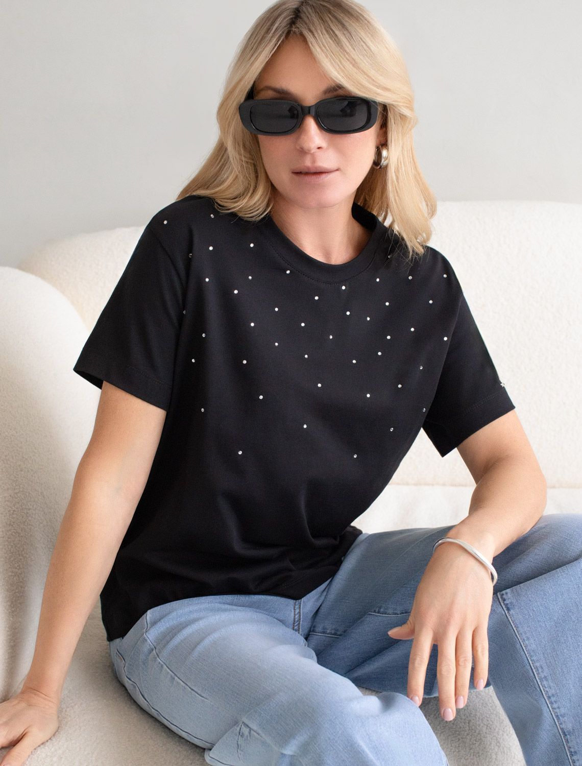 Стильная базовая футболка черного цвета с принтом стразами выполнена из плотного хлопка с эластаном для комфортной посадки на любую фигуру. Прямая футболка классического кроя с круглым вырезом, прекрасно подходит для разных типов фигуры, в том числе и на большие размеры. Мягкость хлопка вместе с небольшой долей эластана гарантирует идеальную посадку и свободу движений. Легкая натуральная дышащая ткань премиального качества делает футболку с коротким рукавом идеальным вариантом для повседневной носки дома, на работу или офис. Однотонная футболка дополнена авторским аккуратным принтом, который придает праздничный и элегантный вид без лишней вычурности. Блестящий принт в виде россыпи страз аккуратно украшает, добавляя изысканный акцент и создавая легкий мерцающий эффект.