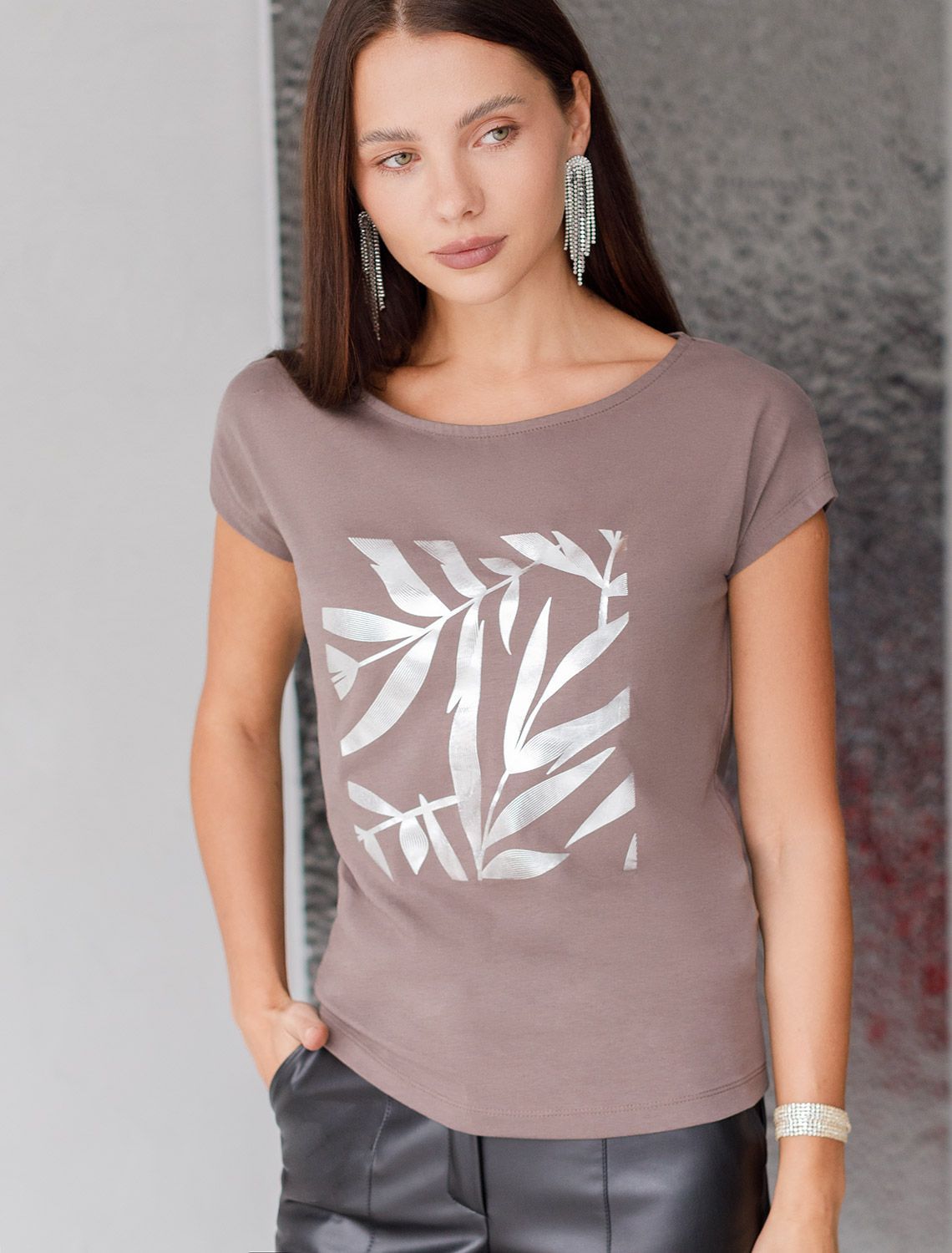 Футболка кофейного цвета идеально подходит для вечеринки и создания яркого образа. Оригинальный блестящий принт из устойчивой фольги в виде серебристых листиков придает изделию шикарный вид, который привлечет внимание на любом мероприятии. Модель с вырезом лодочка и цельнокроеным коротким рукавом обеспечивает свободу движений и комфорт в носке. Такой фасон изделия подходит на большие размеры, гармонично сидит на фигуре и помогает создать легкий акцент на достоинствах. Аккуратный вырез лодочка красиво подчеркивает шею и делает образ элегантным, сохраняя актуальность для разных случаев — от рабочих встреч до вечерних прогулок и праздничных мероприятий.