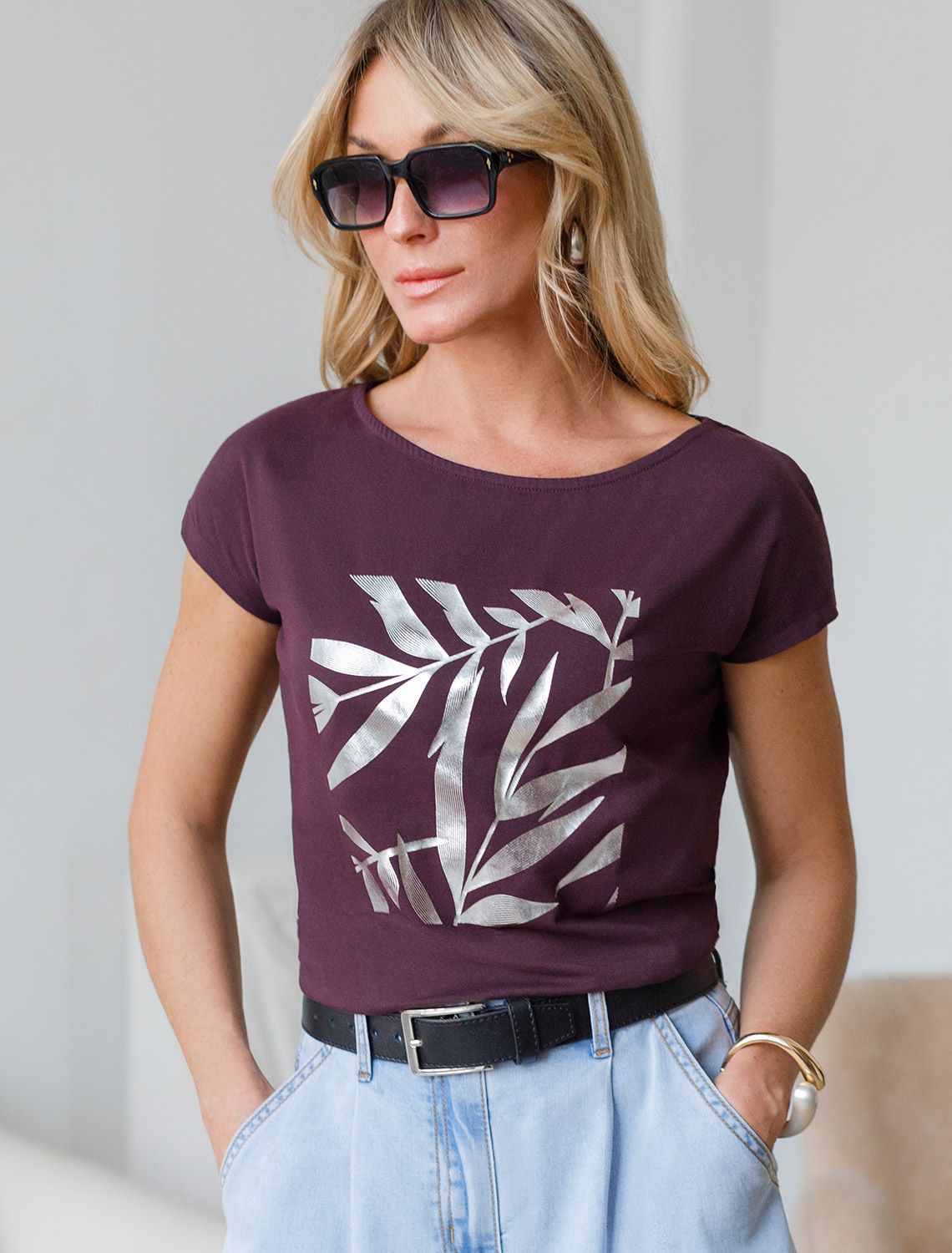 Футболка цвета бургунди идеально подходит для вечеринки и создания яркого образа. Оригинальный блестящий принт из устойчивой фольги в виде серебристых листиков придает изделию шикарный вид, который привлечет внимание на любом мероприятии. Модель с вырезом лодочка и цельнокроеным коротким рукавом обеспечивает свободу движений и комфорт в носке. Такой фасон изделия подходит на большие размеры, гармонично сидит на фигуре и помогает создать легкий акцент на достоинствах. Аккуратный вырез лодочка красиво подчеркивает шею и делает образ элегантным, сохраняя актуальность для разных случаев — от рабочих встреч до вечерних прогулок и праздничных мероприятий.