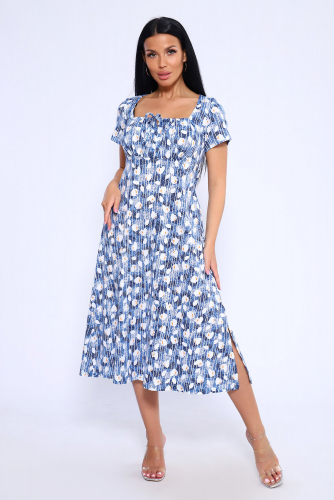 Длинное романтичное платье с короткими рукавами, декорировано квадратным вырезом декольте с завязками на груди. Милое, воздушное платье ниже колена с разрезами по боковым швам. Платье имеет свободный крой А-силуэта, который подходит для разного типа фигуры. Модель подойдет для прогулок, отдыха на пляже.