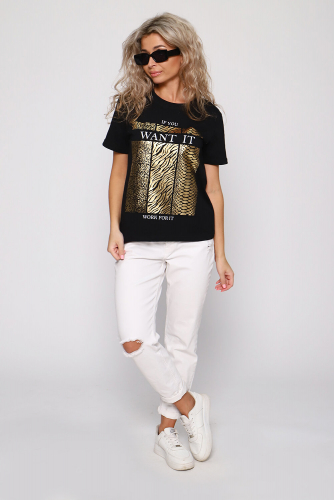 Футболка классического фасона, прямого кроя, с коротким рукавом и округлым вырезом. Декорирована принтом. Универсальная модель футболки отлично подойдет для любого образа и станет необходимой вещью в вашем гардеробе. Ткань кулирка пенье, плотность 160 г.