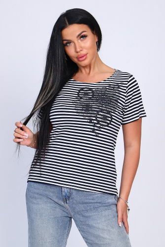 Стильная женская футболка из вискозы в полоску - настоящая находка для модниц, любящих комфорт и красивый вид. Модель с круглым вырезом горловины и коротким рукавом , слегка приталенного силуэта красиво подчеркнет изгибы фигуры и сделает вас женственной в любом наряде: в дерзком молодежном или сдержанном классическом. Футболку украшает изящный рисунок-цветок, что делает ее неповторимой и оригинальной. Универасальная модель женской футболки на каждый день способна стать частью офисного, нарядного, вечернего и повседневного образа.