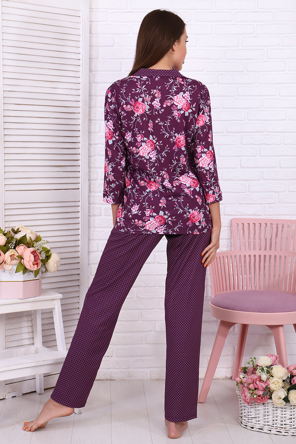 Женский костюм-пижама, состоящий из рубашки и брюк. Комплект сшит из трикотажного полотна нового поколения с цифровой печатью, которая не меняет цвет рисунка в процессе стирки. Содержание полиэстера в ткани позволяет изделию не менять свою форму в процессе носки и практически не мнется. Усадка костюма минимальна. Жакет-рубашка на пуговицах, воротник в английском стиле из ткани компаньона. Рукав 3/4, низ с имитацией манжета. Брюки на широкой резинке, низ брюк выполнен с имитацией манжета. Широкий размерный ряд с 44 по 56, большой ассортимент ярких расцветок на любой вкус. Можно носить, как домашний костюм и как пижаму. Рубашка свободного кроя для удобства домашнего ношения. Любителям носить в обтяжку рекомендуется брать на размер меньше (см. параметры в сантиметрах). Рекомендована стирка при 30-40 градусах в стиральной машине. Отличный подарок любимым женщинам.