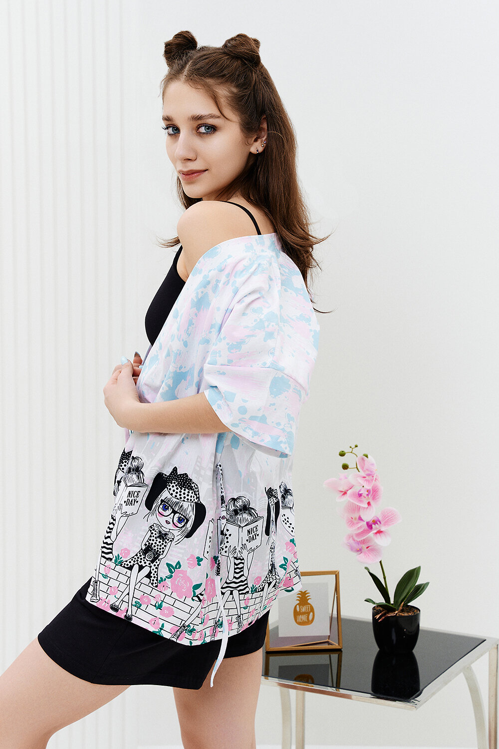 Комплект состоит из топа, шорт и короткого кимоно. Топ из эластичного полотна, на тонких бретелях, длиной выше линии талии, с резинкой по низу. Горловина и бретели топа обработаны бейкой из основного полотна. Шорты из кулирки с лайкрой на поясе, с боковыми карманами. В верхней части передних половинок по шву притачивания пояса расположены складки. Кимоно выполнено из отделочного полотна из кулирки, полуприлегающего силуэта, длиной до середины бедра, с коротким рукавом. Горловина обработана обтачкой.