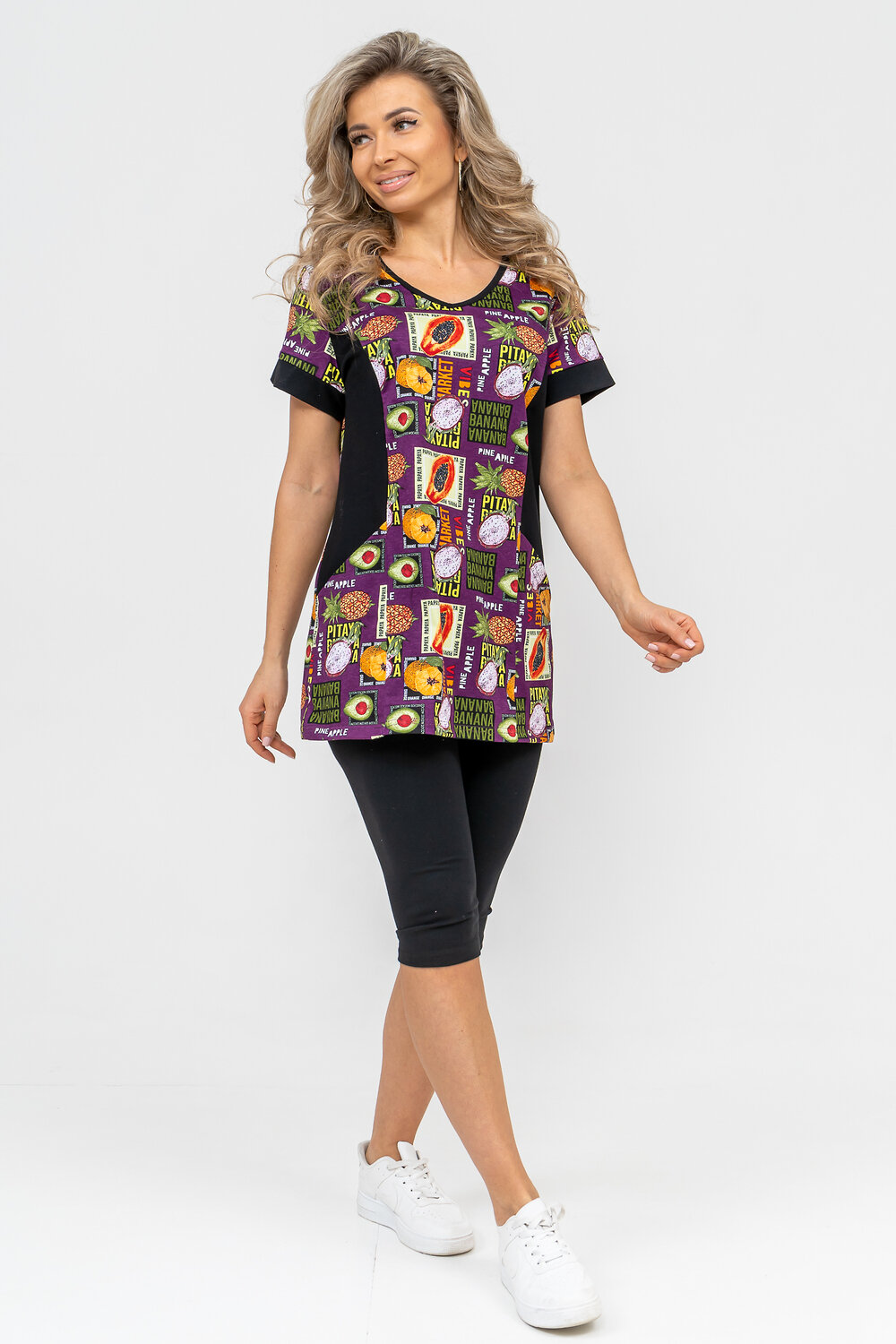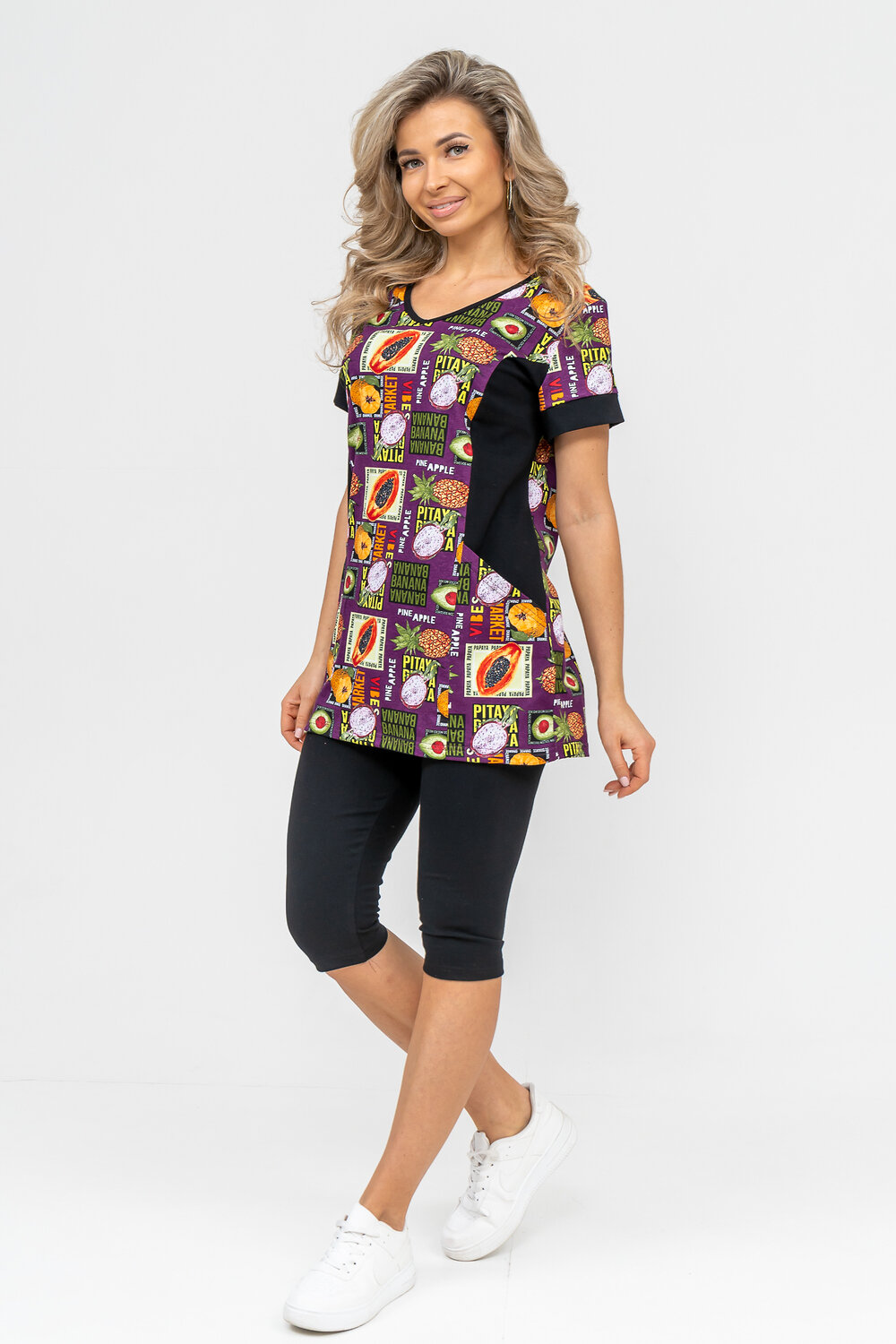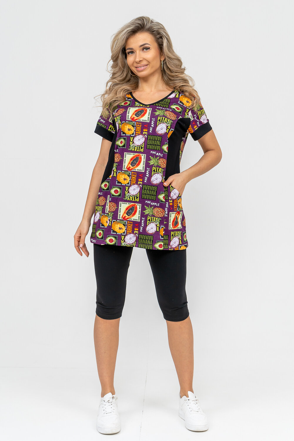 Женский костюм полуприлегающего силуэта состоит из туники и бриджей. 100% дышащий хлопок туники и эластичная вискоза бриджей несут в себе удобство при носке, гигроскопичность и износостойкость. V-образный вырез горловины придаёт изделию женственный вид. Для удобства туника имеет вместительные накладные карманы и втачные рукава с манжетами. Рельефы на полочке изделия создают идеальную посадку и безупречный внешний вид. Бриджи на резинке с высокой посадкой. В костюме такого плана Вы будете чувствовать себя комфортно как дома, так и на любимой даче. Эта двойка идеально подойдет для летнего отдыха на даче, на море или просто для девушек, которые хотят чувствовать себя уютно и комфортно дома. Летний женский костюм подходит для поездок и путешествий, загородного отдыха на природе, а также для получения лечения в больнице или санатории. Повседневное хлопковое изделие с бриджами - отличная идея для подарка любимой жене, маме, сестре или подруге на день рождения, 8 Марта или по любому другому приятному поводу. Рекомендация: для того чтобы продлить яркую жизнь Вашему костюму для дома и отдыха из хлопка, стирку производить при температуре не выше 30 градусов, а во избежание деформации изделия не прибегать к ручному отжиму (не перекручивать), утюжить слегка недосушенное изделие утюгом на паровом режиме. Покупайте наши красивые и удобные домашние костюмы с бриджами и носите с удовольствием! Приятных покупок!