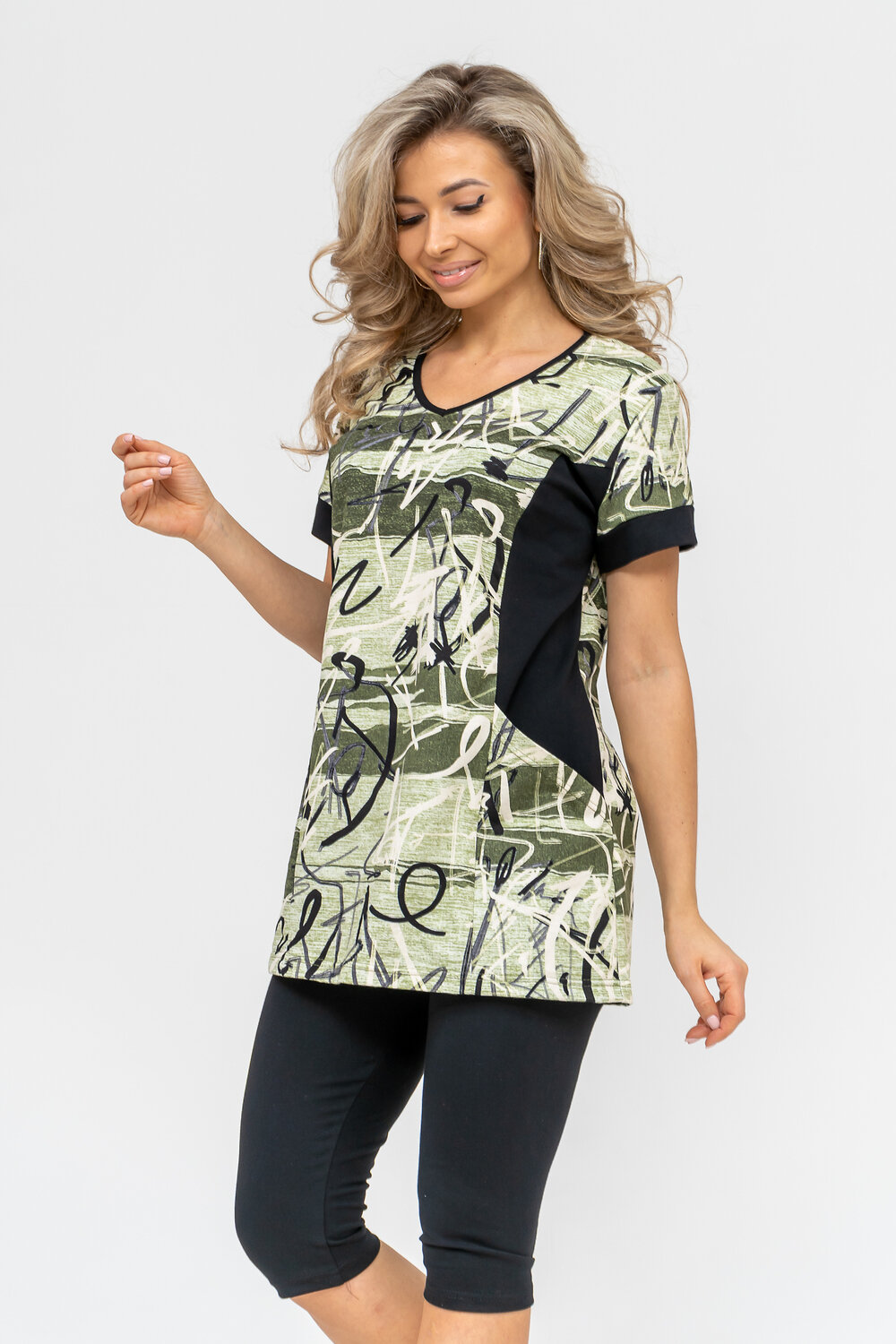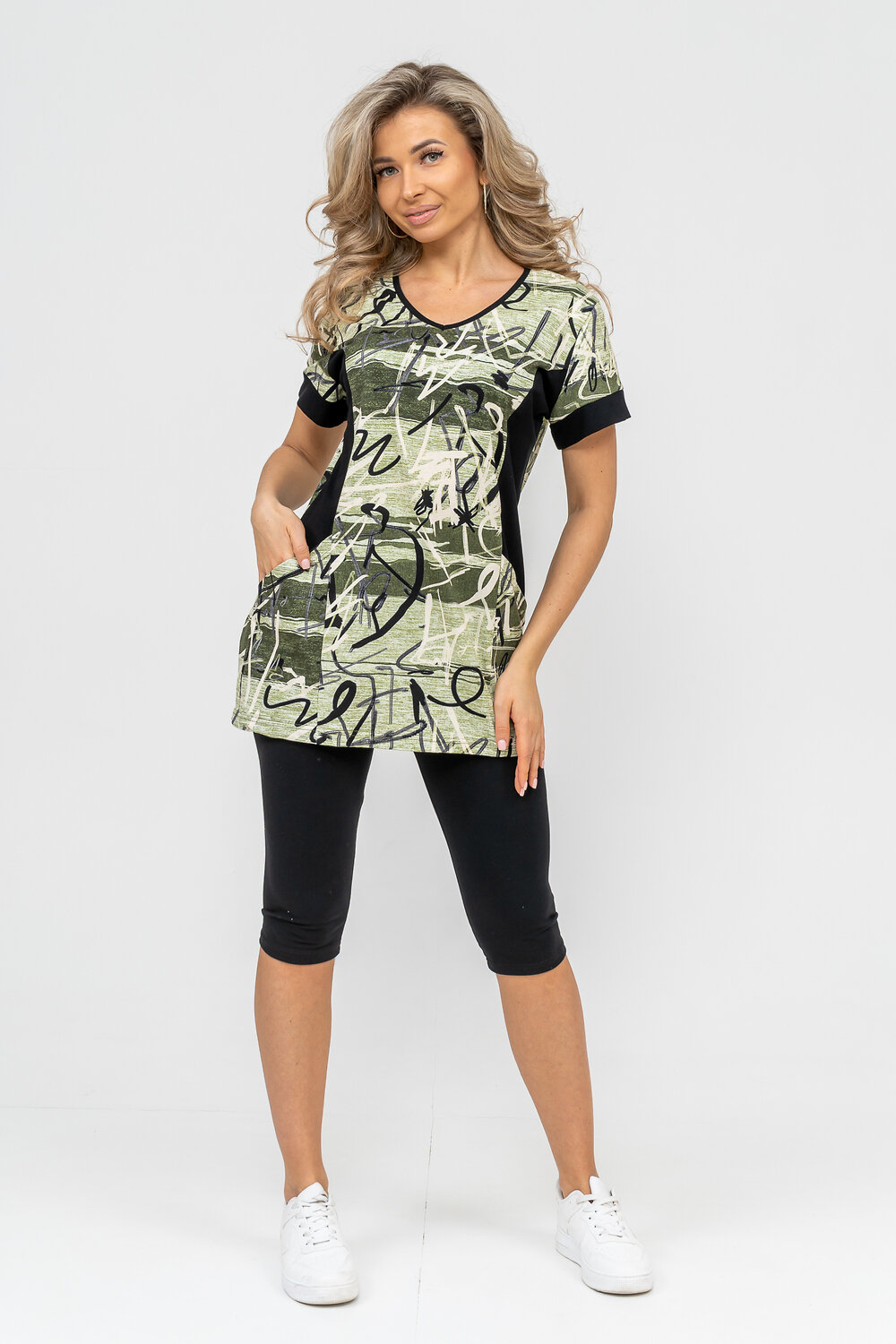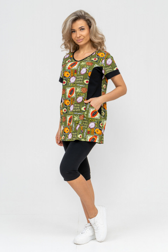 Женский костюм полуприлегающего силуэта состоит из туники и бриджей. 100% дышащий хлопок туники и эластичная вискоза бриджей несут в себе удобство при носке, гигроскопичность и износостойкость. V-образный вырез горловины придаёт изделию женственный вид. Для удобства туника имеет вместительные накладные карманы и втачные рукава с манжетами. Рельефы на полочке изделия создают идеальную посадку и безупречный внешний вид. Бриджи на резинке с высокой посадкой. В костюме такого плана Вы будете чувствовать себя комфортно как дома, так и на любимой даче. Эта двойка идеально подойдет для летнего отдыха на даче, на море или просто для девушек, которые хотят чувствовать себя уютно и комфортно дома. Летний женский костюм подходит для поездок и путешествий, загородного отдыха на природе, а также для получения лечения в больнице или санатории. Повседневное хлопковое изделие с бриджами - отличная идея для подарка любимой жене, маме, сестре или подруге на день рождения, 8 Марта или по любому другому приятному поводу. Рекомендация: для того чтобы продлить яркую жизнь
