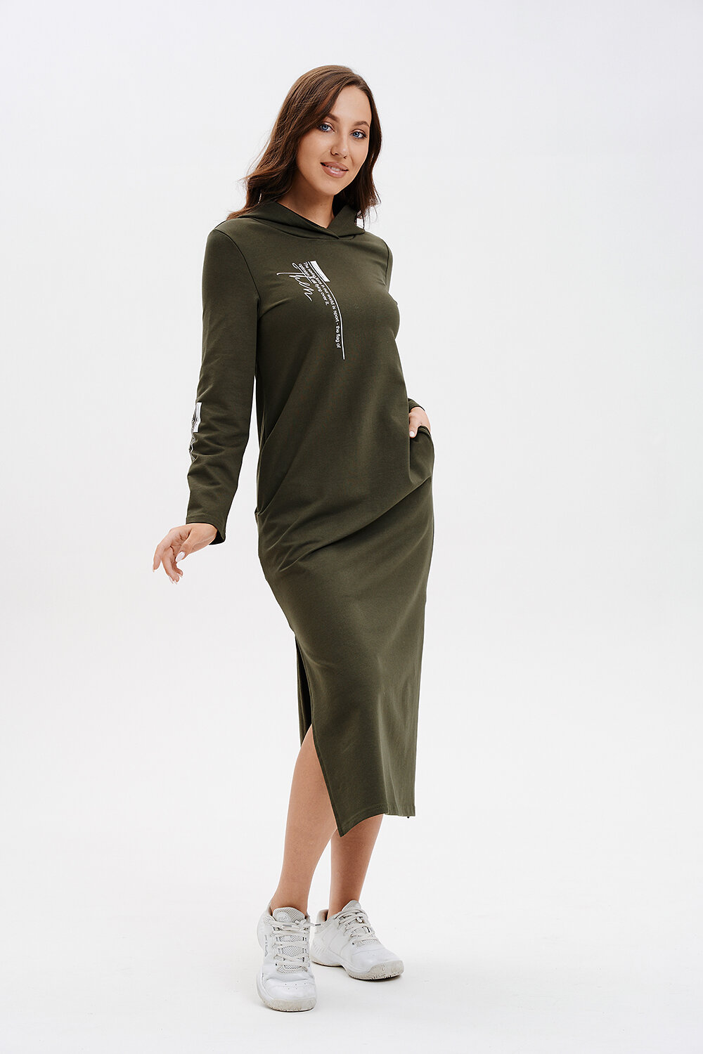 Стильное платье имеет объёмный капюшон, два боковых кармана и длинные разрезы по бокам. Удобное длинное трикотажное платье - беспроигрышное решение для любого случая!