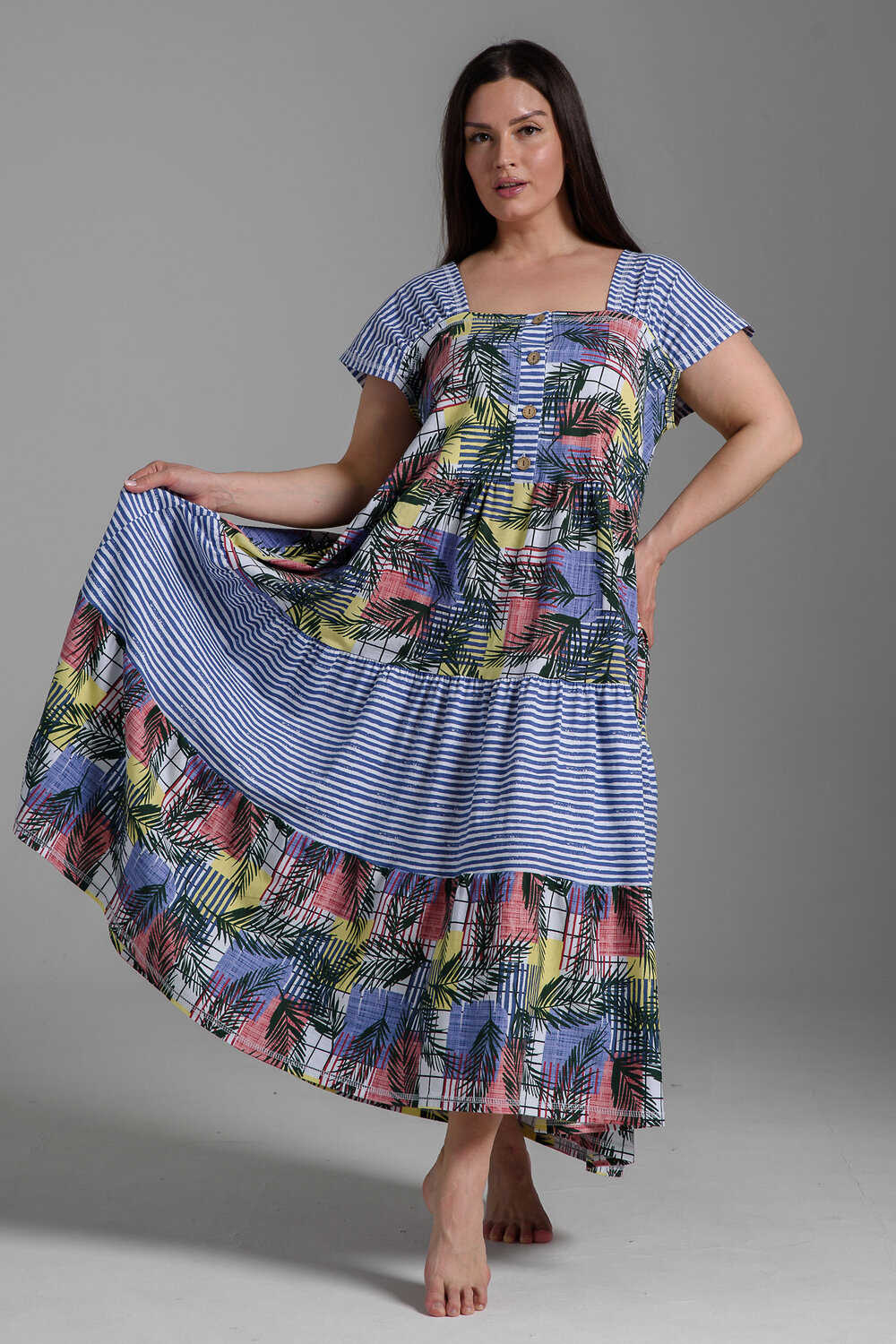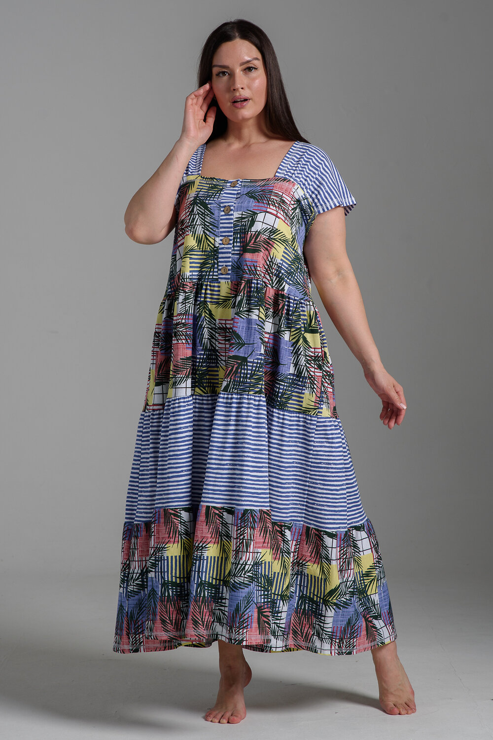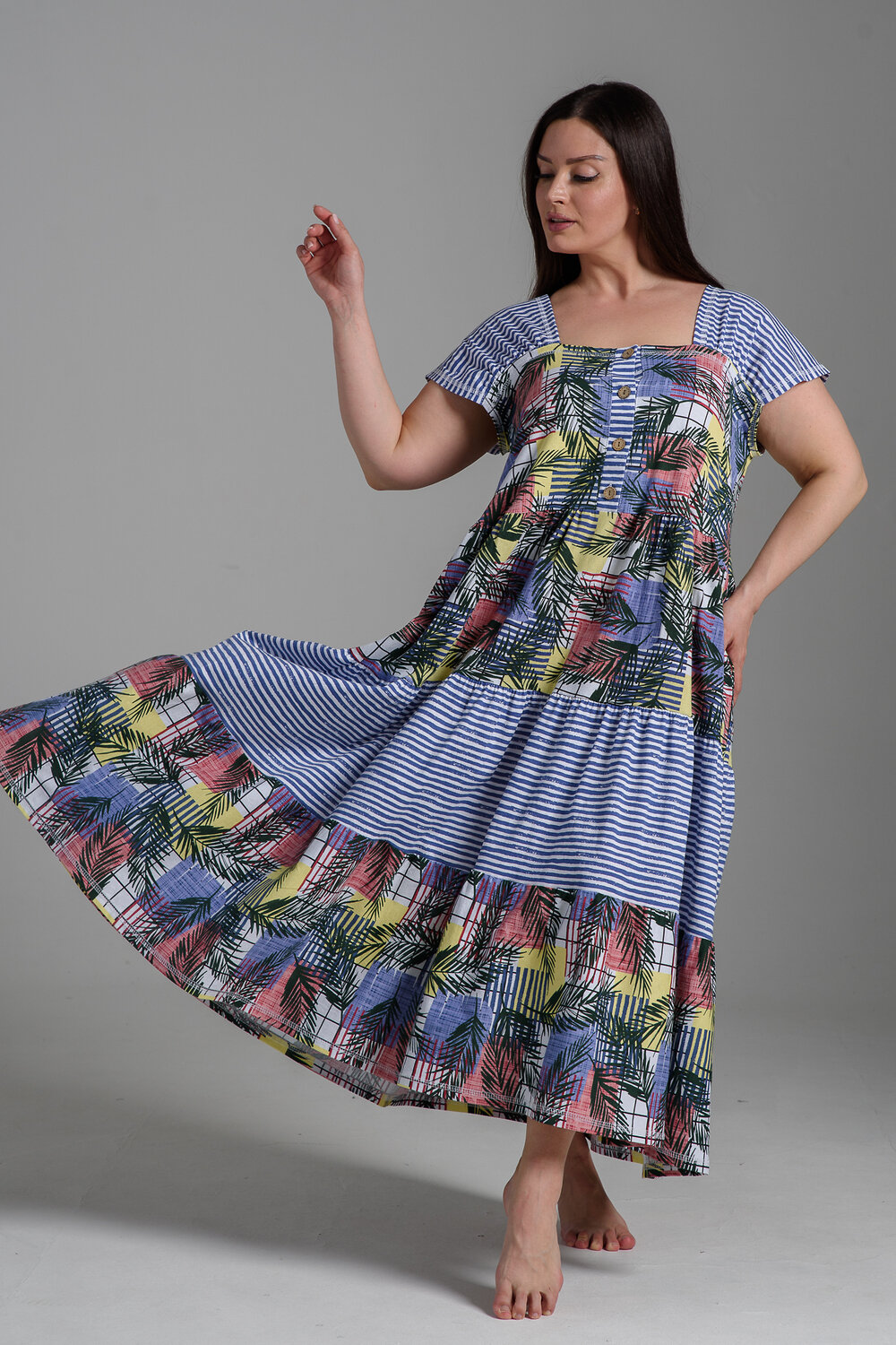 Платье женское расширенное к низу. На полочке планка до линии талии , застежка на четыре петли-пуговицы. Нижняя часть платья состоит из трех ярусов , верхняя часть которых присборена. Бретели расширены, имитируя короткий цельнокроенный рукав.В боковых швах внутренние карманы. Бретели, планка и средний ярус из отделочной ткани в полоску.