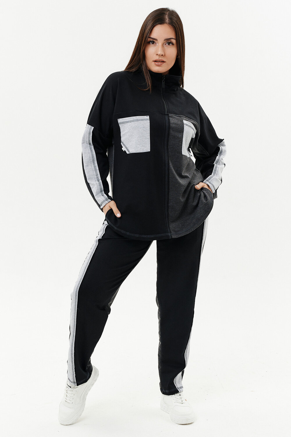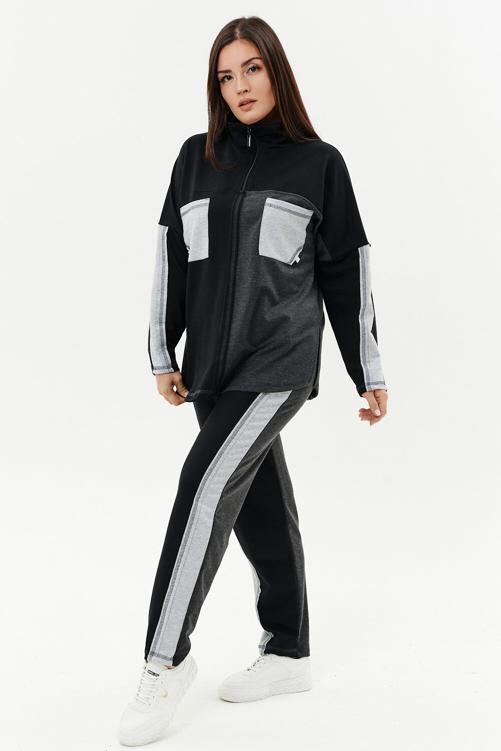 Костюм женский: толстовка и брюки. Толстовка прямого силуэта, брюки свободные по бедрам, зауженные к низу. Рукав цельнокроенный со швом. Воротник-стойка застегивается на тесьму-молнию. Карман кенгуру. В костюме удачно сочетается однотонный футер с меланжированным. На спинке и полочке кокетки. Нагрудные карманы, лампасы на рукавах и брюках из контрастной отделочной ткани. На передних половинках брюк внутренние карманы.