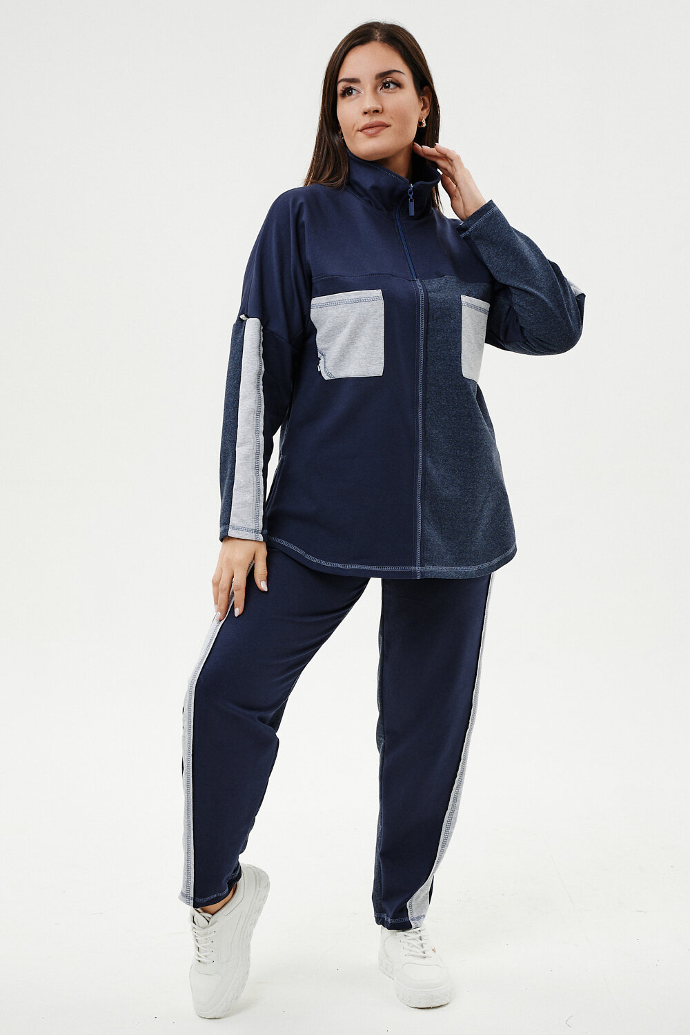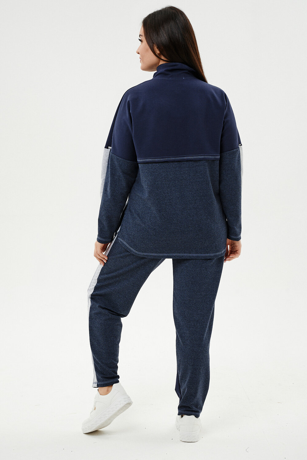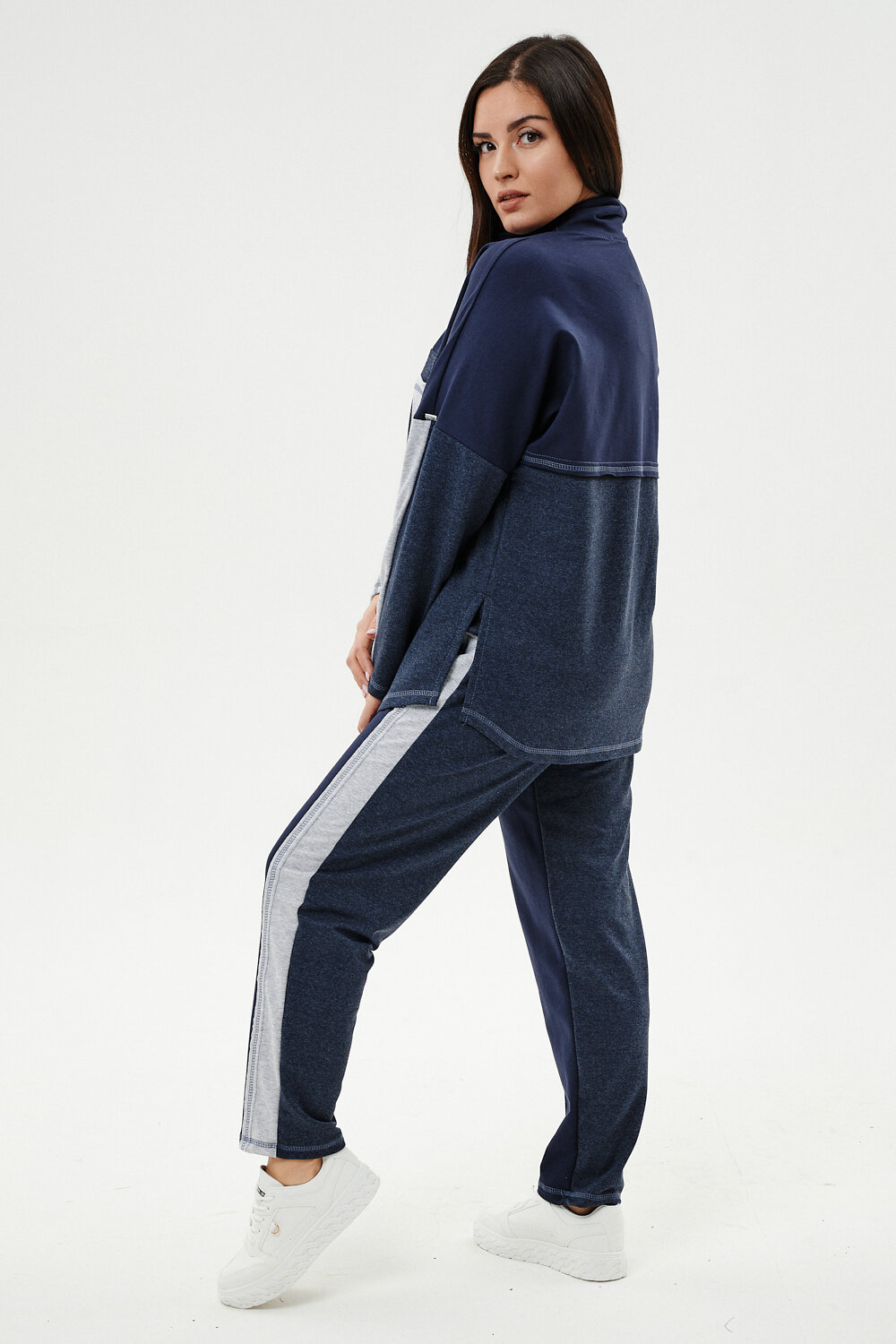 Костюм женский: толстовка и брюки. Толстовка прямого силуэта, брюки свободные по бедрам, зауженные к низу. Рукав цельнокроенный со швом. Воротник-стойка застегивается на тесьму-молнию. Карман кенгуру. В костюме удачно сочетается однотонный футер с меланжированным. На спинке и полочке кокетки. Нагрудные карманы, лампасы на рукавах и брюках из контрастной отделочной ткани. На передних половинках брюк внутренние карманы.