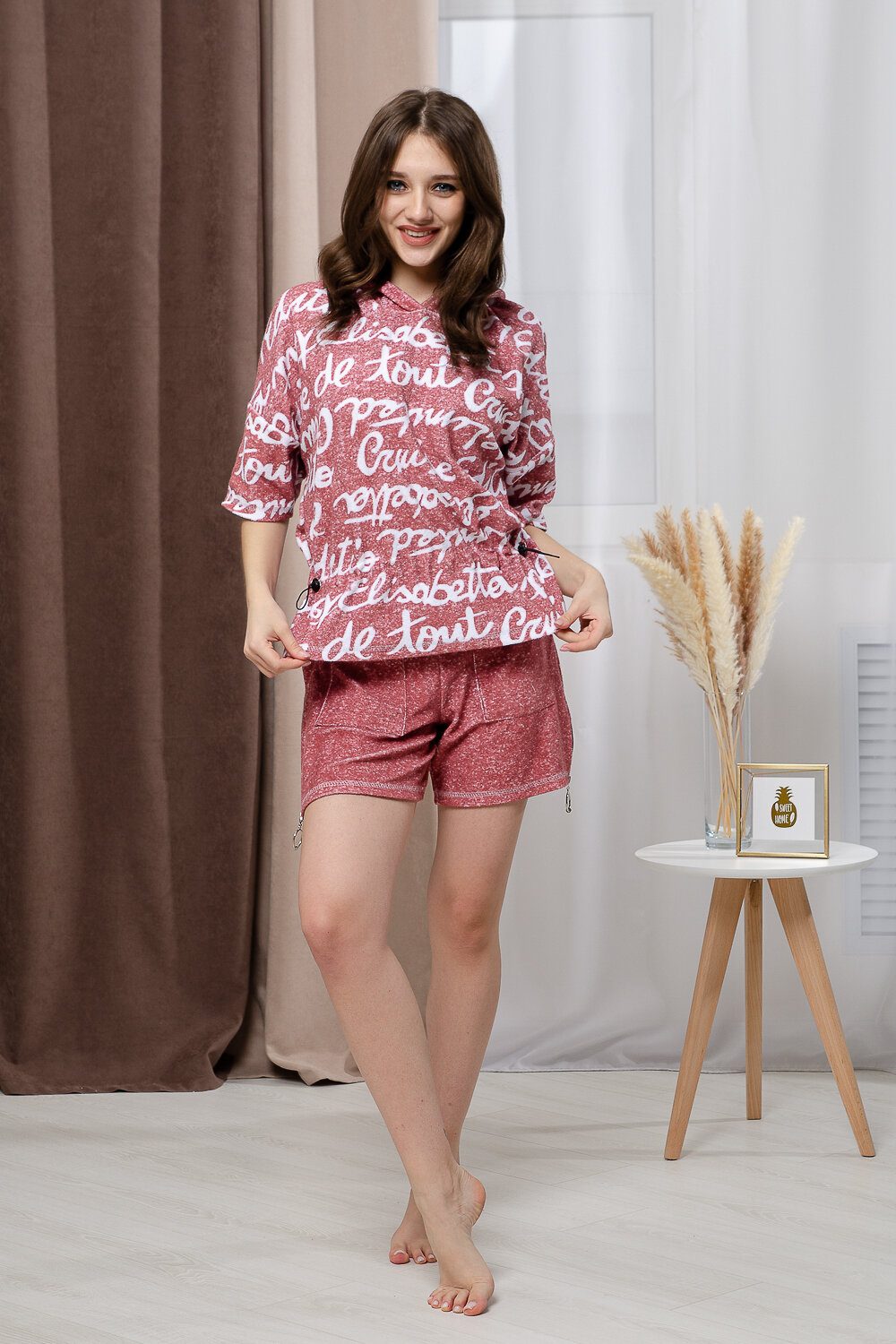 Костюм состоит из туники и шорт. Туника прямая, свободная, с резинкой по талии, с ушками на капюшоне, с разрезами в нижней части боковых швов. Рукав короткий. Шорты прямые, на поясе, с накладными карманами спереди. Вдоль боковых швов расположены молнии.