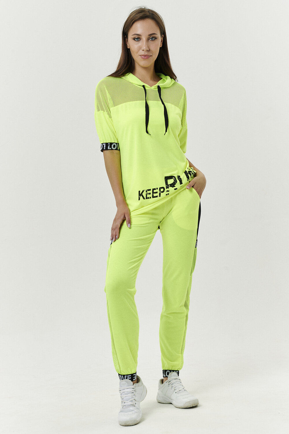 Костюм состоит из туники и брюк. Туника прямая, свободная, с капюшоном из сетки, с удлиненной спинкой. Рукав короткий, обработанный декоративной резинкой. Кокетка полочки выполнена из сетки. Вдоль центра спинки расположена декоративная вставка из отделочного полотна и сетки. Брюки свободные, длинные, с карманами, на эластичном поясе. Низ брюк обработан декоративной резинкой. Вдоль боковых швов расположен лампас из отделочного полотна и сетки. В средней части лампаса расположен карман.