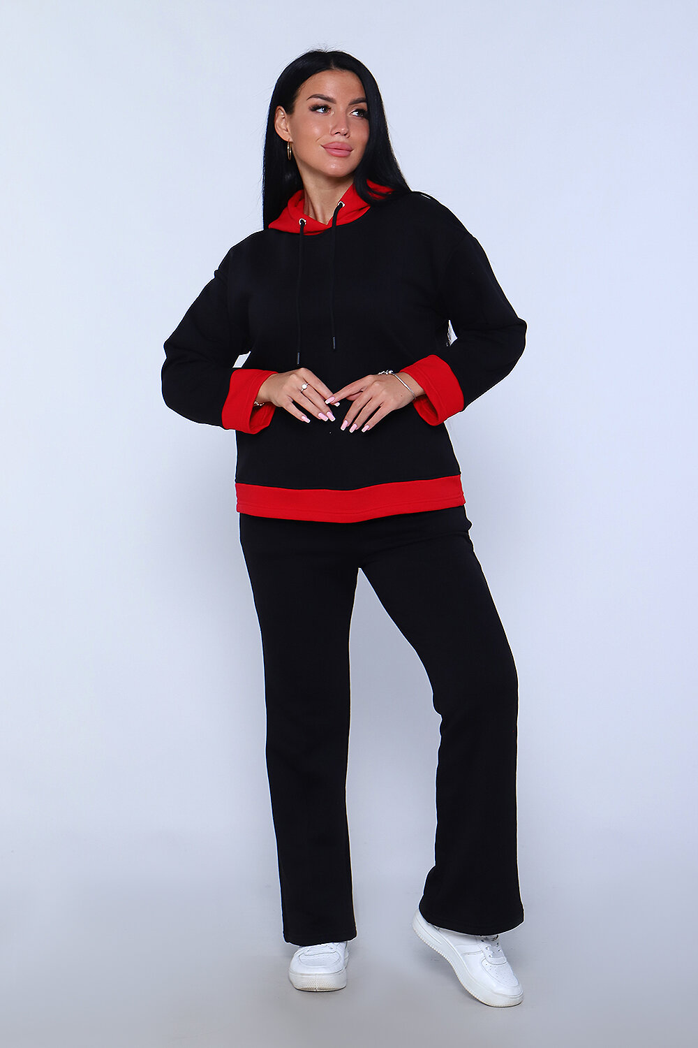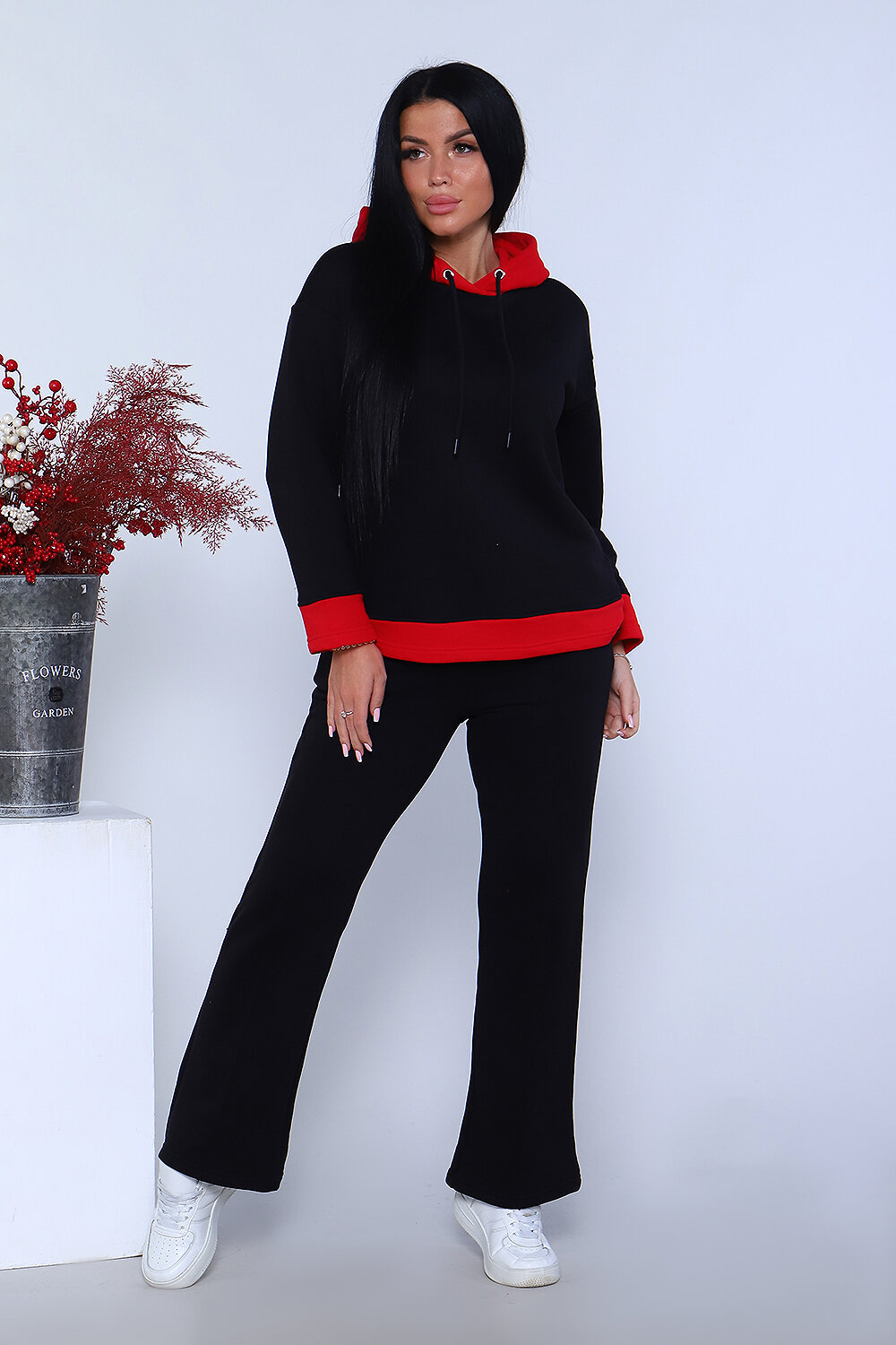 Элегантный женский костюм полуприлегающего силуэта, состоящий из худи и брюк сшит из трикотажного полотна премиум качества - футер 3-х нитка петля без начеса. Высокое качество ткани обеспечит комфорт и удобство на долгое время. Хлопковая изнаночная сторона изделия дарит комфортные ощущения при ношении костюма. Брюки силуэта клеш с широким поясом с декоративной отсрочкой и с отстроченной стрелкой на передней половине брюк, что вытягивает силуэт и визуально делает ноги длиннее, что добавляет женственности образу. В боковых швах брюк расположены карманы с отрезным бочком. Худи прямое, свободное с длинными рукавами. Низ рукава и низ худи отделаны декоративными манжетами контрастного цвета. Вырез горловины округлый, с двойным капюшоном контрастного цвета в тон манжет. Объём капюшона регулируется декоративным шнурком. Сочетание комфорта и стиля делает этот костюм модным и удобным для каждой девушки и женщины. Идеальный комплект обеспечивает удобную посадку на любую фигуру, позволяет свободно двигаться, гулять, отдыхать и заниматься спортом, благодаря тому, что костюм не сковывает движения. Базовые расцветки, прекрасно сочетающиеся цвета основной ткани и ткани - компаньона позволят подобрать тот костюм, который идеально соответствует вашему вкусу и предпочтениям. Стильный костюм подойдёт для любого времени года, на любую погоду. Удобный костюм подойдет как для домашнего, так и уличного ношения. Для беременных и молодых мам! Идеальный подарок прекрасным женщинам!