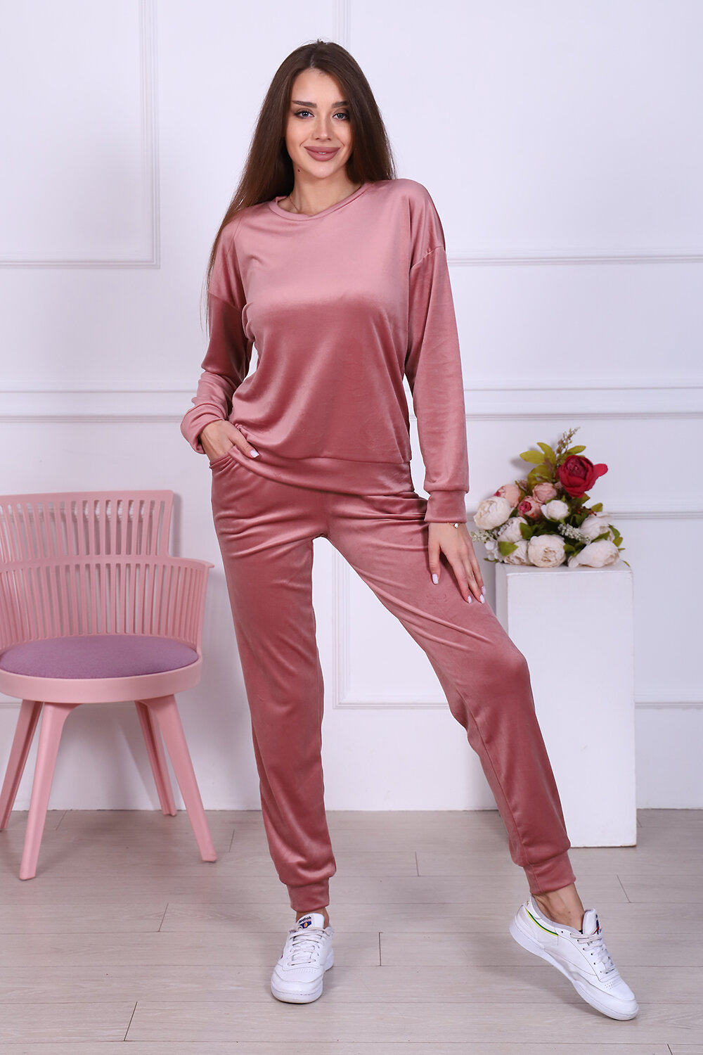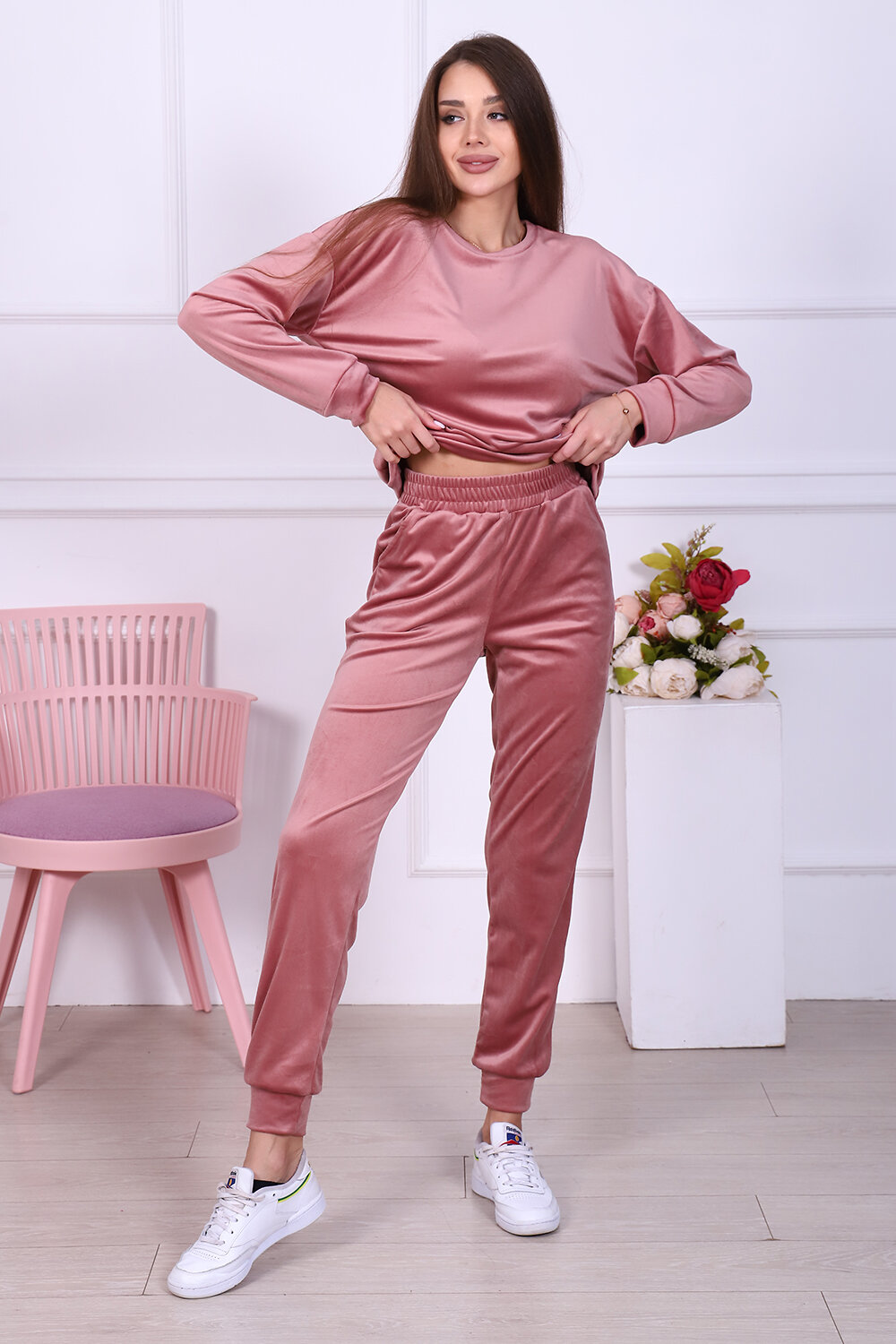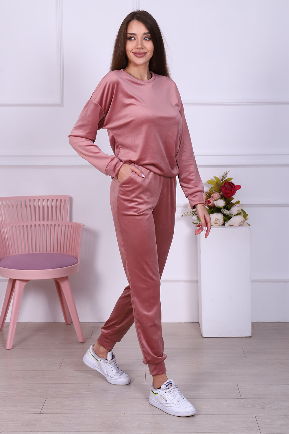 Женский домашний костюм, состоящий из джемпера с длинным рукавом и брюк. Брюки с карманами в боковых швах со скошенным входом для удобства, с широким притачным поясом на резинке, отделан декоративной отстрочкой. Низ брюк на притачной манжете из основной ткани. Джемпер свободного покроя с округлой горловиной чуть зауженный внизу манжетой за счет небольшой сборки. Рукав втачной, низ рукава на притачной манжете шириной 6 см. Костюм выполнен из нежной на ощупь бархатной ткани - иконвелюра, который переливается на свету и очень приятен на ощупь. Изделие не мнется, не требует глажки, что очень удобно в использовании. Можно носить дома, как домашний комплект, как пижаму для сна, а также на выход, как костюм для прогулок в холодное время года, как спортивный костюм, на дачу, для школы и т. д. Большой выбор нежных и насыщенных расцветок на любой вкус! Отличный подарок самым любимым!