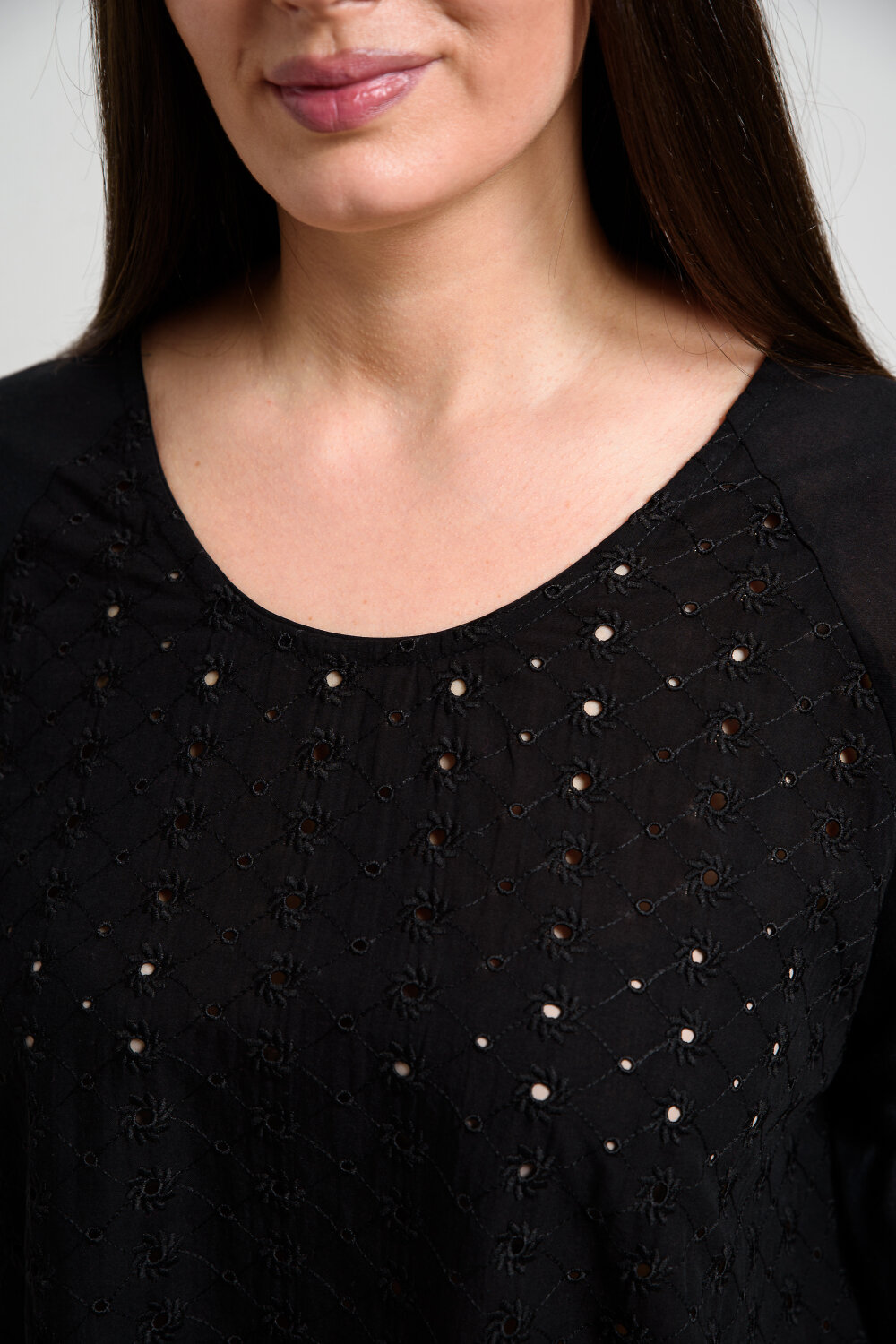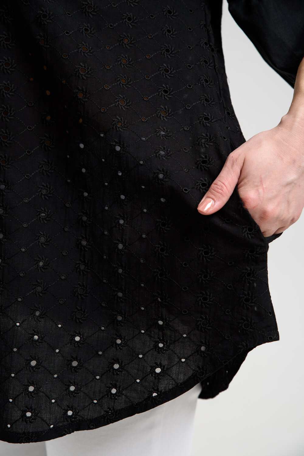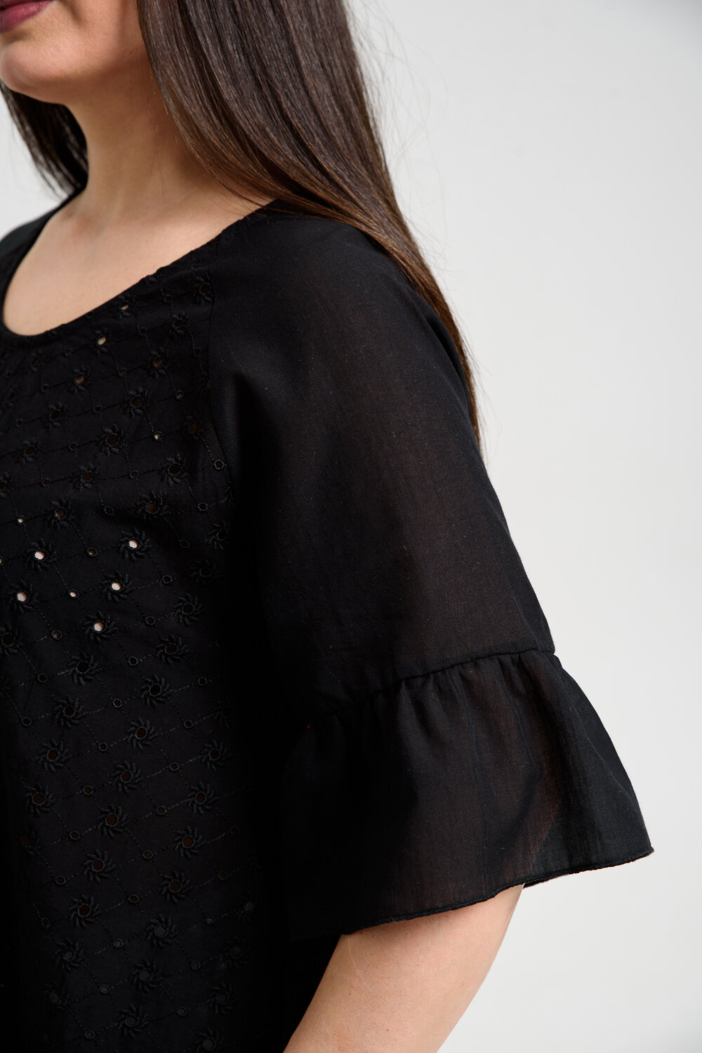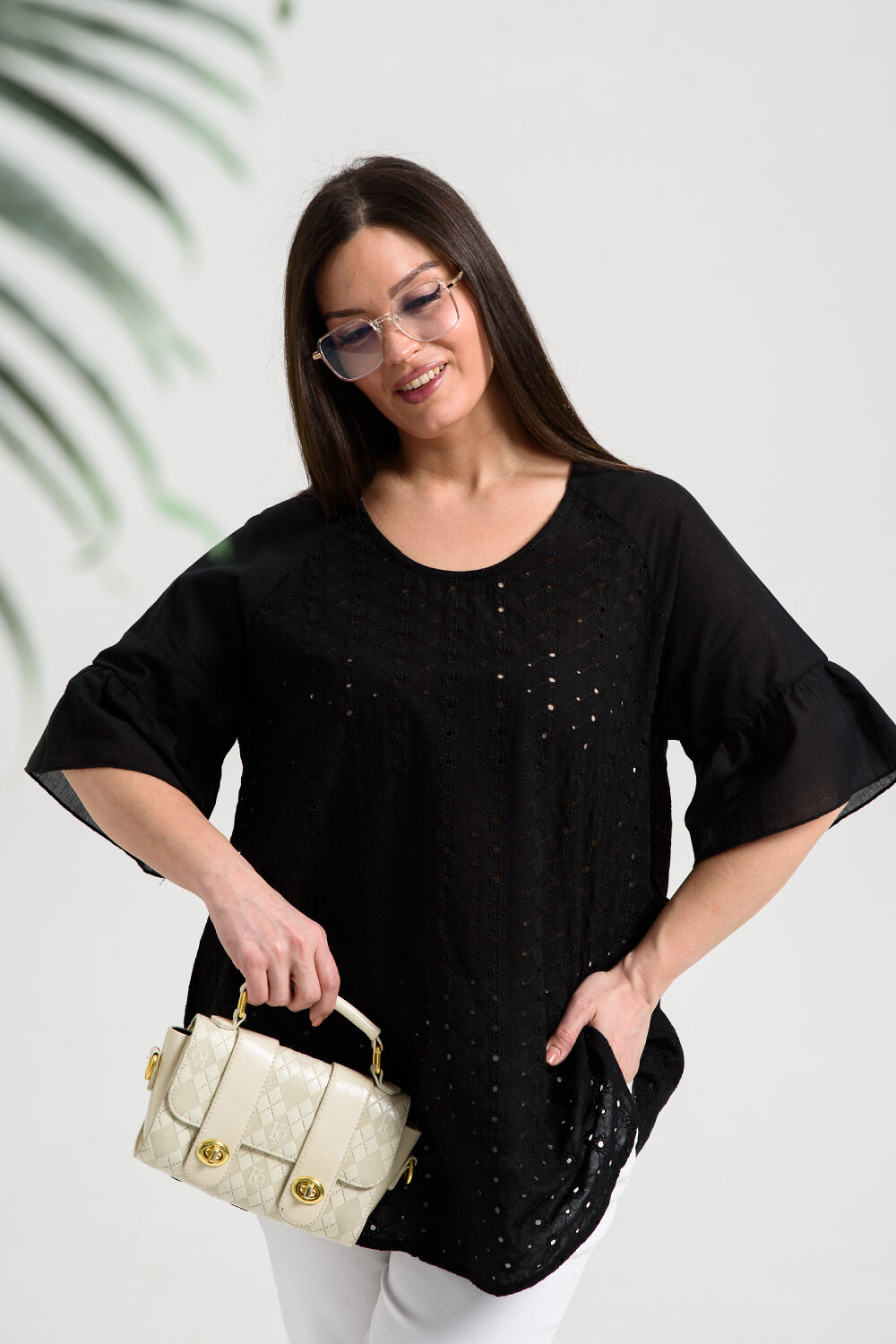Туника женская, расширенная к низу. Горловина округлая. Рукав реглан, внизу рукава широкая рюша. Низ туники фигурный, в боковых швах внутренние карманы. Свободная, легкая, не стесняющая движений туника незаменима для летнего гардероба любой женщины.