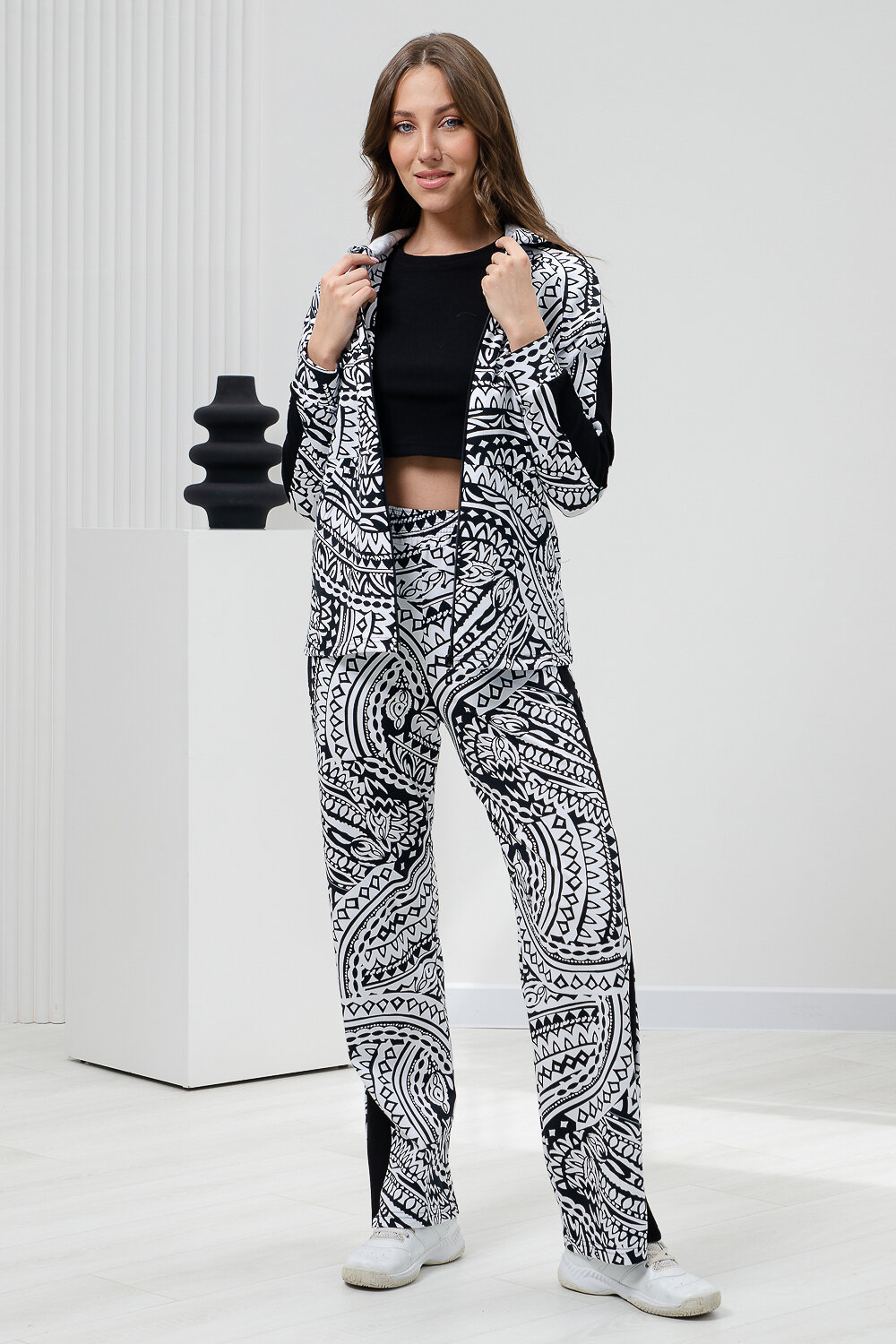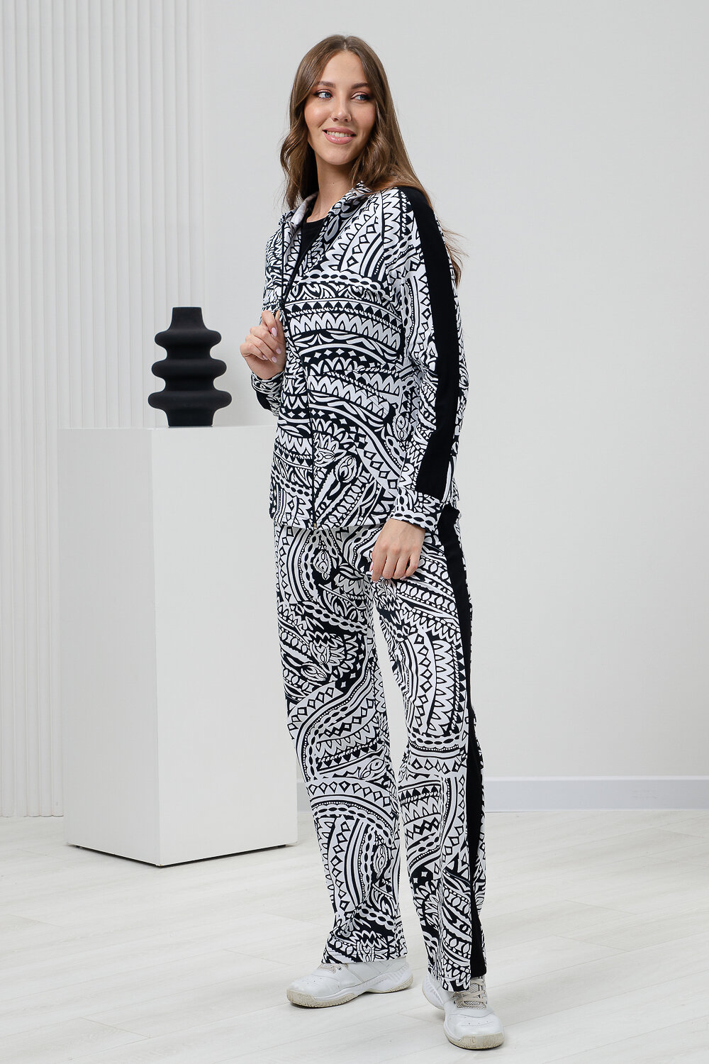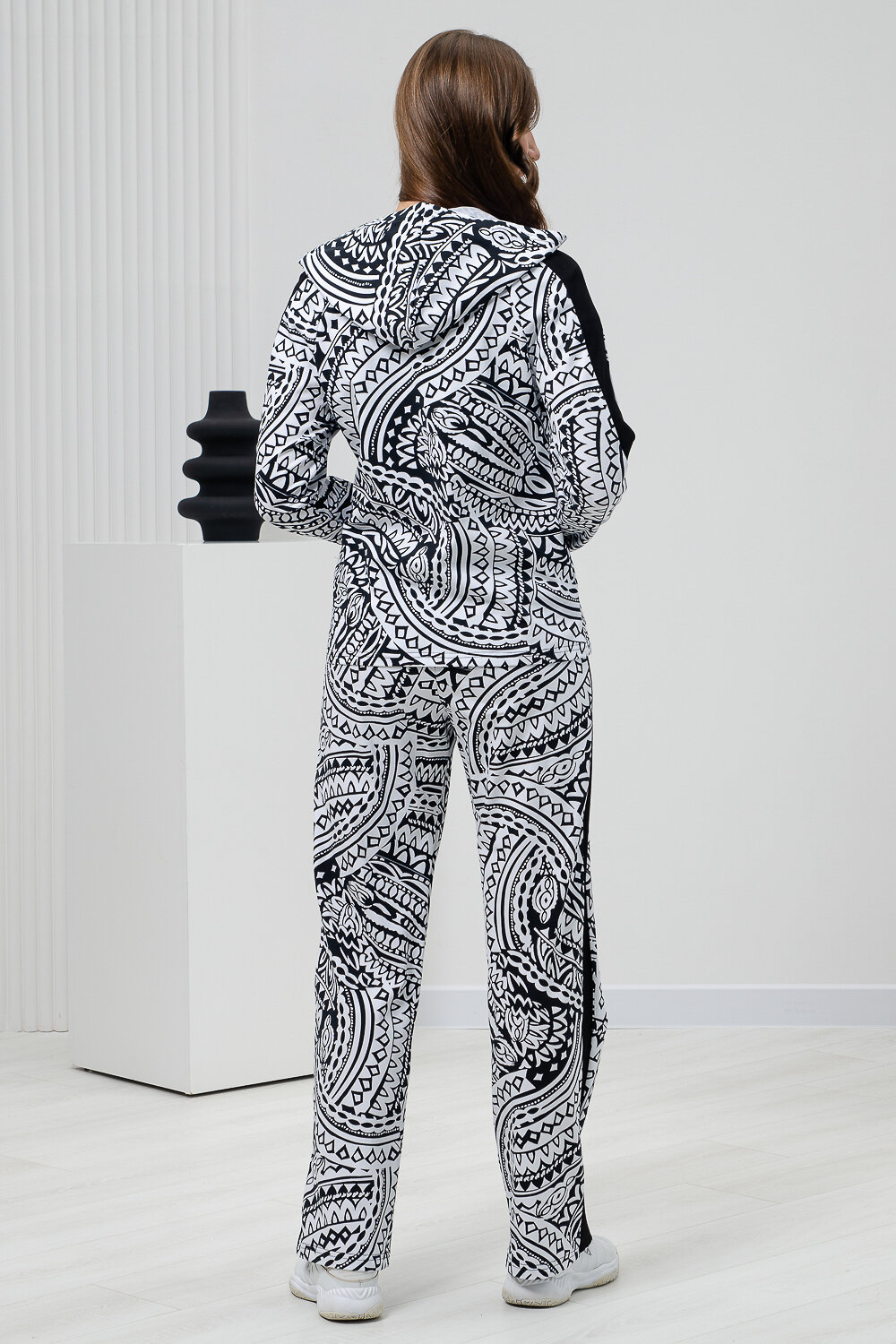 Костюм состоит из толстовки на молнии и брюк. Брюки прямые, на поясе, с боковыми карманами, с лампасами из отделочного полотна вдоль боковых швов. Толстовка прямая, на молнии, с капюшоном, с карманами кенгуру, длиной до середины бедра. Рукав реглан, длинный, на манжете, с лампасами из отделочного полотна вдоль рукава.