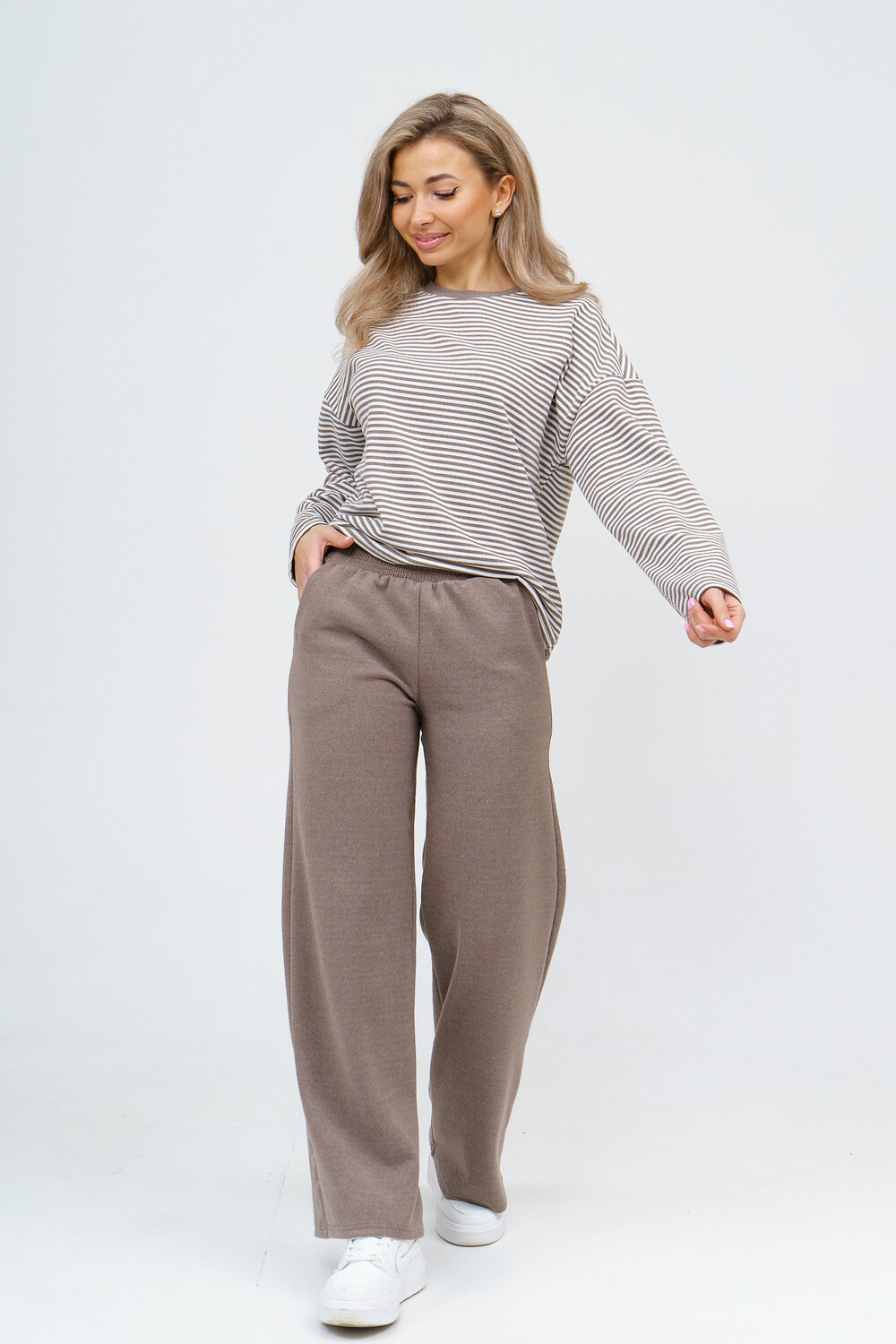 Женский костюм выполнен из двухстороннего флис полара высокого качества. Флис полар - высокотехнологичный материал, прошедшей особую обработку. Ткань отличается высокими теплозащитными свойствами, при этом является дышащей. По своим характеристикам она не уступает шерстяным полотнам. И даже в сыром состоянии удерживает тепло у тела. Материал прочный, эластичный, влагостойкий. Воздухопроницаемая гигроскопичная ткань создает для тела комфортный микроклимат. Материал гипоаллергенный, подходит для изготовления одежды детям, в том числе новорожденным. Изделия из флиса легкие, не мнутся, не деформируются, не вытягиваються.В такой одежде удобно и комфортно. Эластичность материала позволяет легко двигаться. Костюм состоит из лонгслива и брюк. Лонг в стиле OVERSIZE ( одежда свободного кроя ) - это свобода самовыражения, позволяющая чувствовать себя комфортно и стильно одновременно. Горловина футболки выполнена с обтачкой. Линия плеча спущена, длинный рукав. Женские стильные брюки - трубы представлены с вместительными боковыми карманами. Пояс выполнен на специализированной круговой поясной машине, что делает швы ровными и качественными. А профессиональные закрепки на поясе, придают изделию законченный вид и качество. Свободный крой прекрасно будет смотреться на дамах с любыми формами. Костюм такого плана представлен в широкой размерной сетке, что позволяет выбрать его как девушке, так и женщине. Костюм модных расцветок с полосой, будет удачным выбором для поездок в отпуск, на пикник, для школы, для активного отдыха и прогулок по городу. Будет гармонично сочетаться как с кроссовками, так и с ботинками. Используя эту модель в качестве домашнего костюма, Вы поймёте, что это именно тот самый идеальный вариант, в котором будете себя чувствовать удобно, комфортно и современно. Костюм с брюками - это настоящая находка для тех, кто ценит свою индивидуальность!