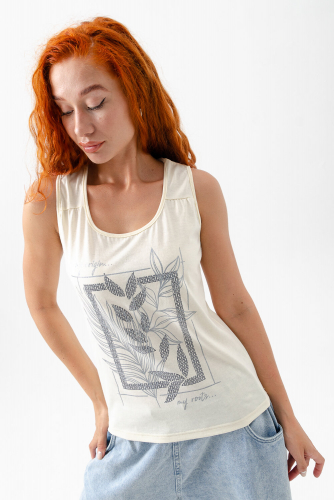 Футболка полуприлегающего силуэта, с округлой горловиной, длиной до середины бедра. Рукав втачной короткий. Горловина обработана бейкой из основного полотна.