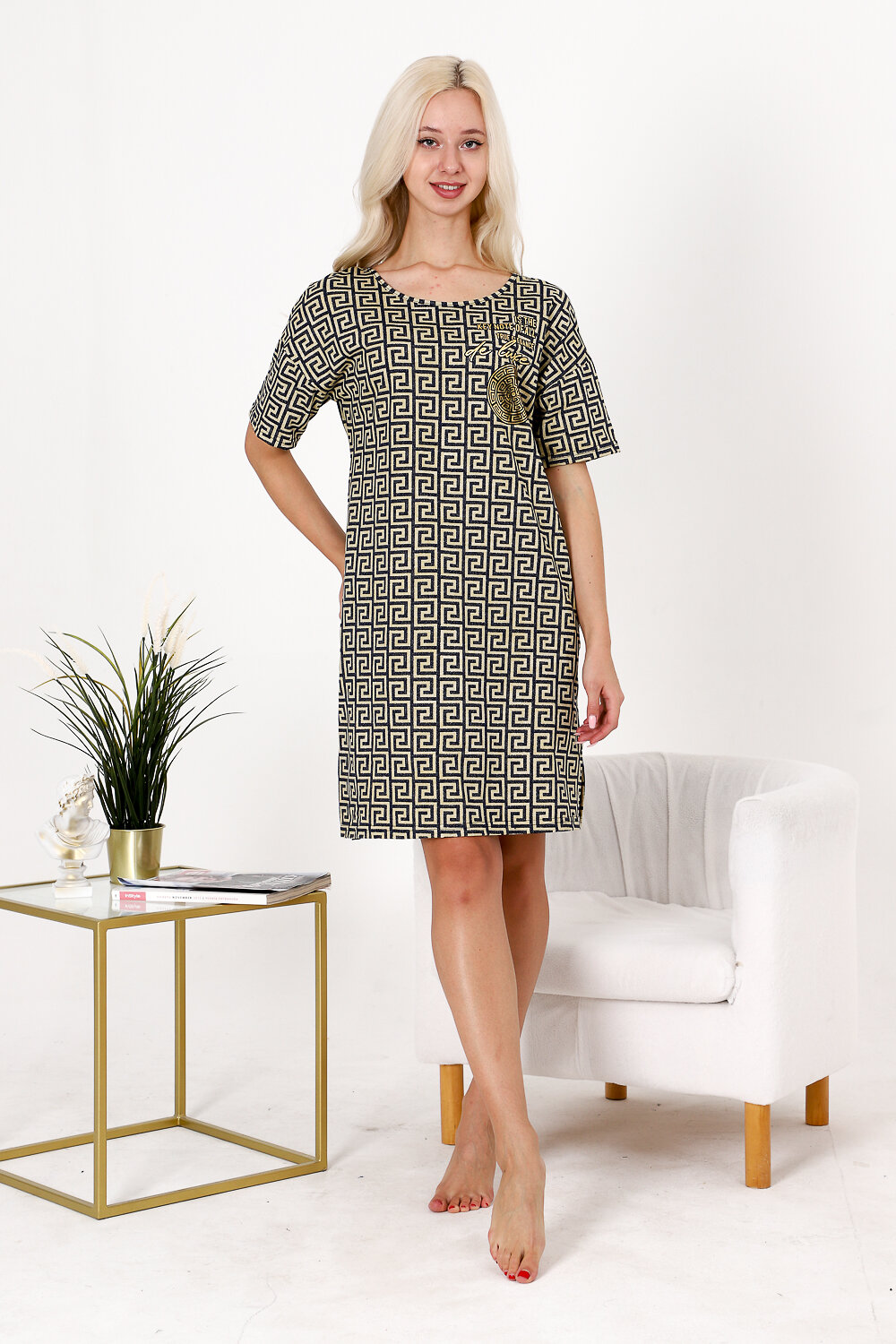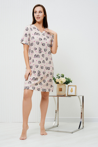 Туника прямого силуэта, с округлой горловиной, с разрезами в нижней части боковых швов. Рукав короткий. В верхней части спинки обработан фигурный вырез. Горловина обработана бейкой из основного полотна.