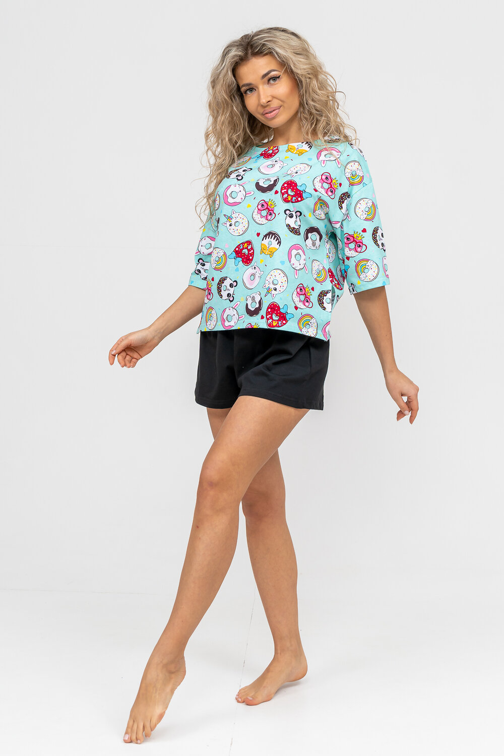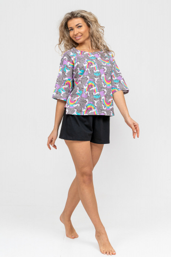 Женский модный костюм - это невероятно удобный вариант одежды для дома, сна, отдыха или пижамной вечеринки. Домашний костюм двойка сшит из натурального хлопка, лёгкого и приятного материала. Пижама состоит из свободной футболки с новым трендовым дизайном ткани и свободных шорт. Стильный костюм комфортно садится по фигуре, выглядит женственно и привлекательно, очаровывая всех. А также модель такого плана - это отличная идея для полезного и практичного подарка на день рождения, 14 февраля, 8 марта и любой другой праздник. Мы уверены, что эта хлопковая пижама подарит Вам истинное наслаждение при каждодневном использовании. Выбирайте деликатный способ стирки при температуре 30С, тогда домашний комплект прослужит долго.