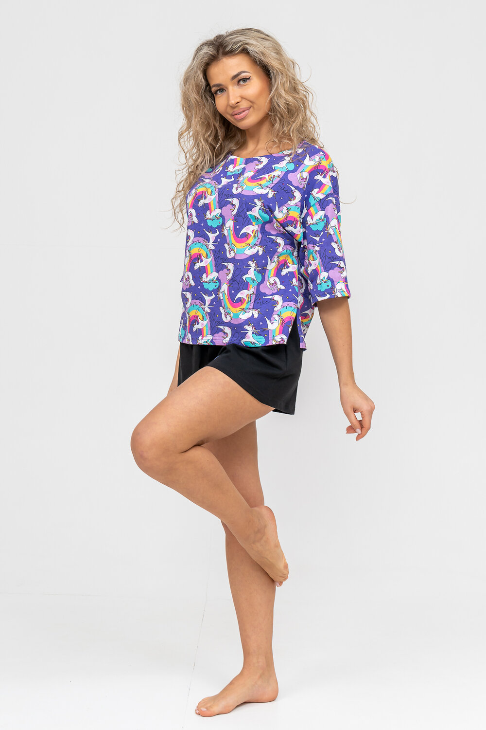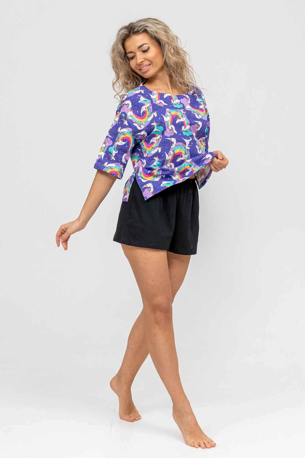 Женский модный костюм - это невероятно удобный вариант одежды для дома, сна, отдыха или пижамной вечеринки. Домашний костюм двойка сшит из натурального хлопка, лёгкого и приятного материала. Пижама состоит из свободной футболки с новым трендовым дизайном ткани и свободных шорт. Стильный костюм комфортно садится по фигуре, выглядит женственно и привлекательно, очаровывая всех. А также модель такого плана - это отличная идея для полезного и практичного подарка на день рождения, 14 февраля, 8 марта и любой другой праздник. Мы уверены, что эта хлопковая пижама подарит Вам истинное наслаждение при каждодневном использовании. Выбирайте деликатный способ стирки при температуре 30С, тогда домашний комплект прослужит долго.