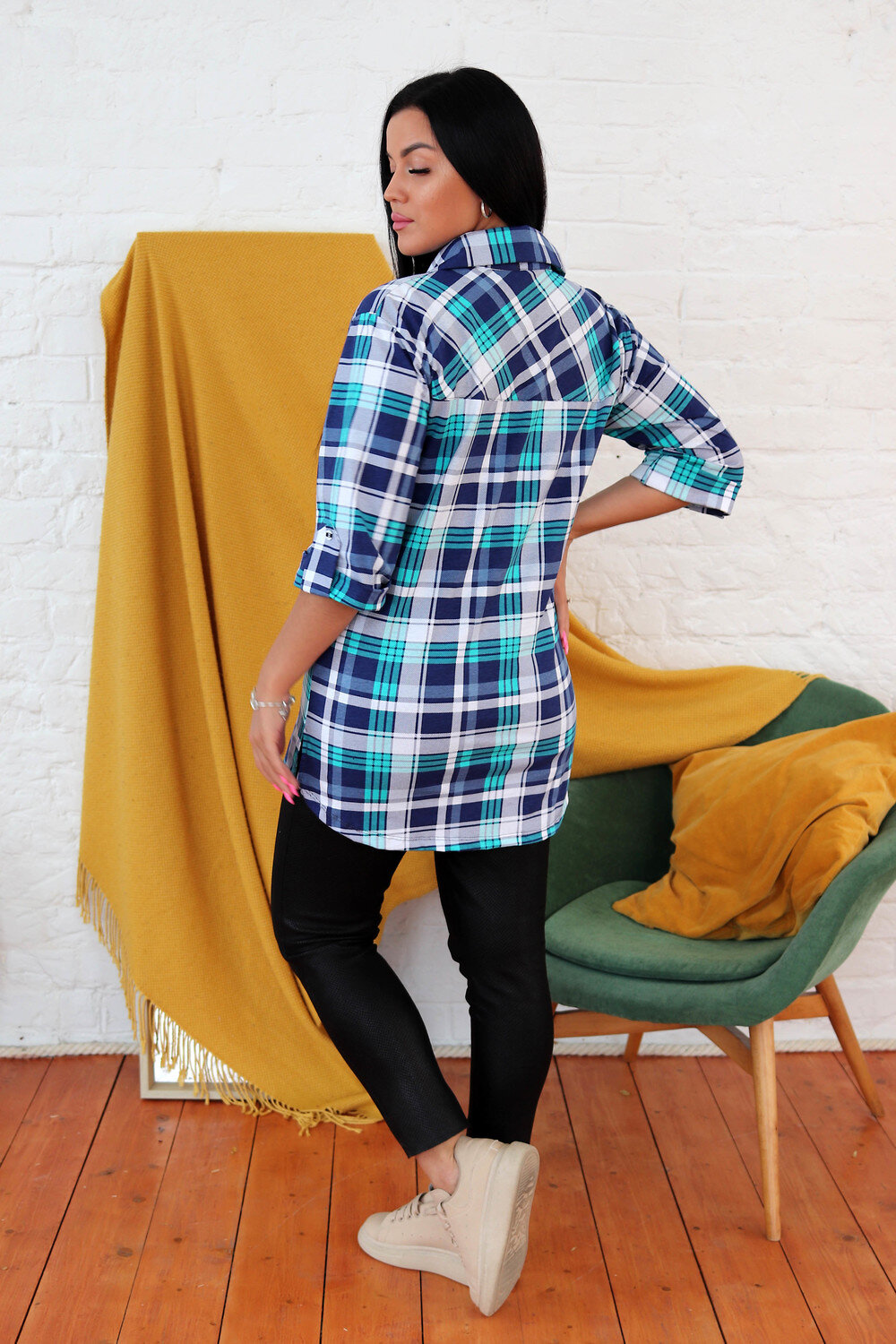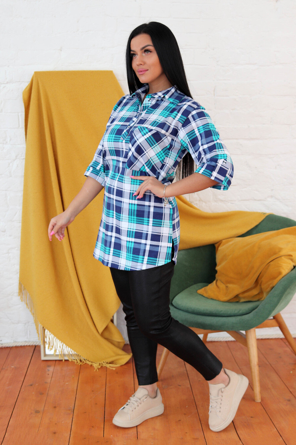 Туника клетка выполнена из ткани кулирки хлопок 100%. На полочке планка с пуговицами, карман, воротник рубашечный со стойкой, рукава на манжете с патой. Внизу легкое закругление, по бокам разрезы, на спинке кокетка. Туника подойдет для отдыха, дома и прогулок.