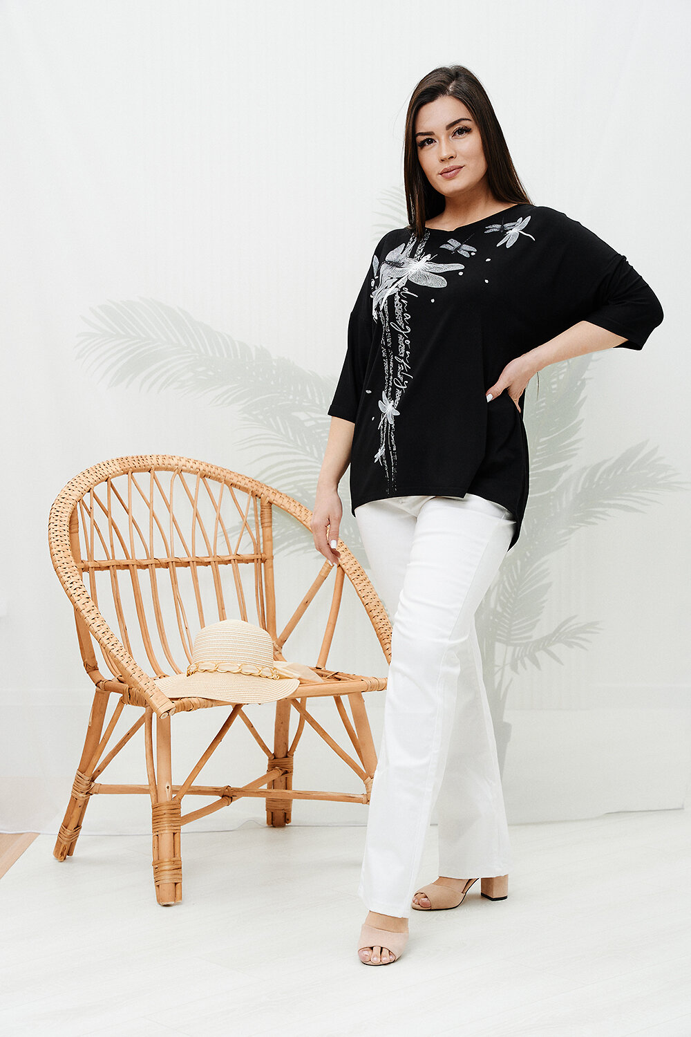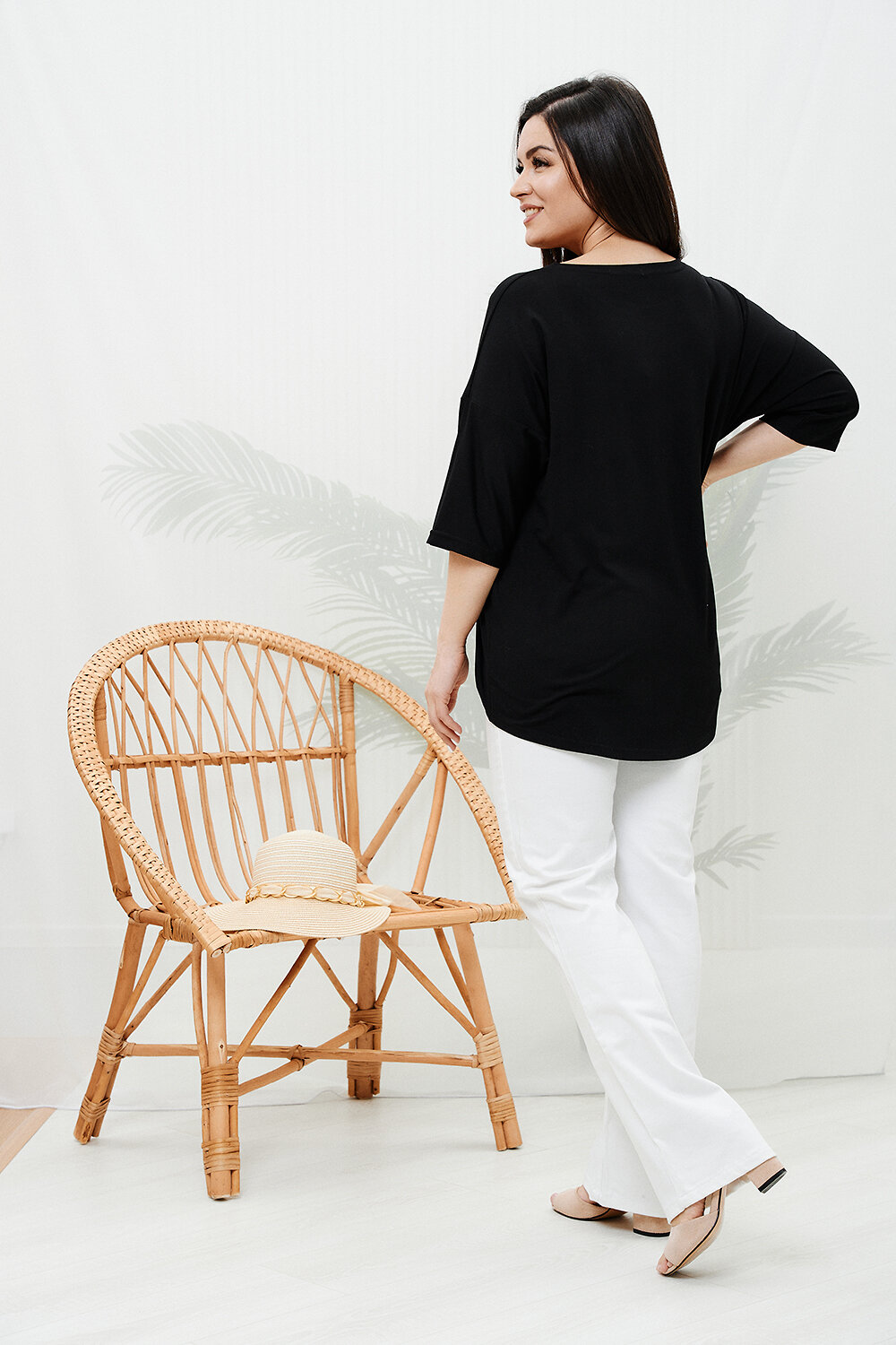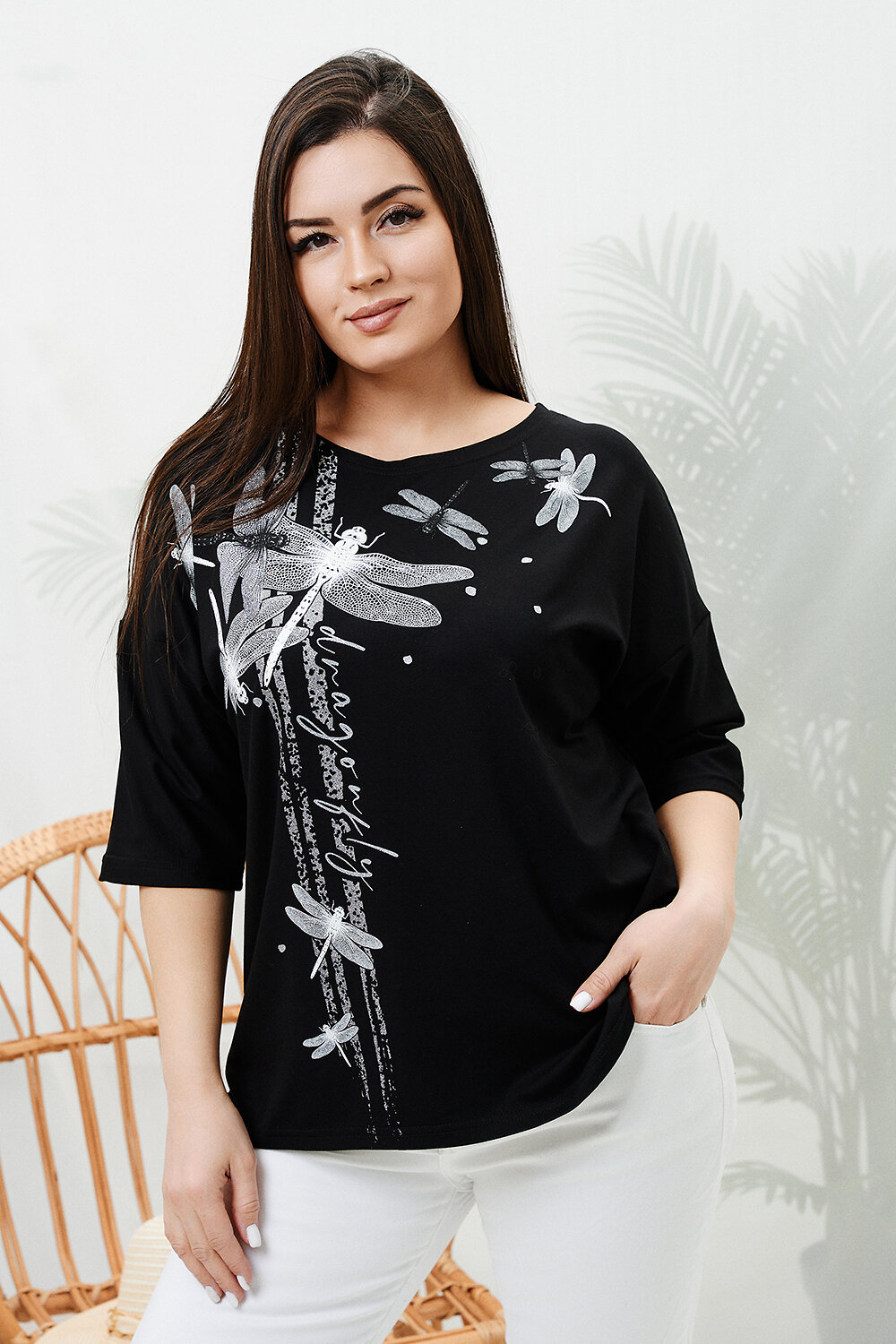 Туника женская прямого силуэта. Рукав цельнокроенный со швом. Горловина округлая. Низ фигурный. На полочке модный принт.
