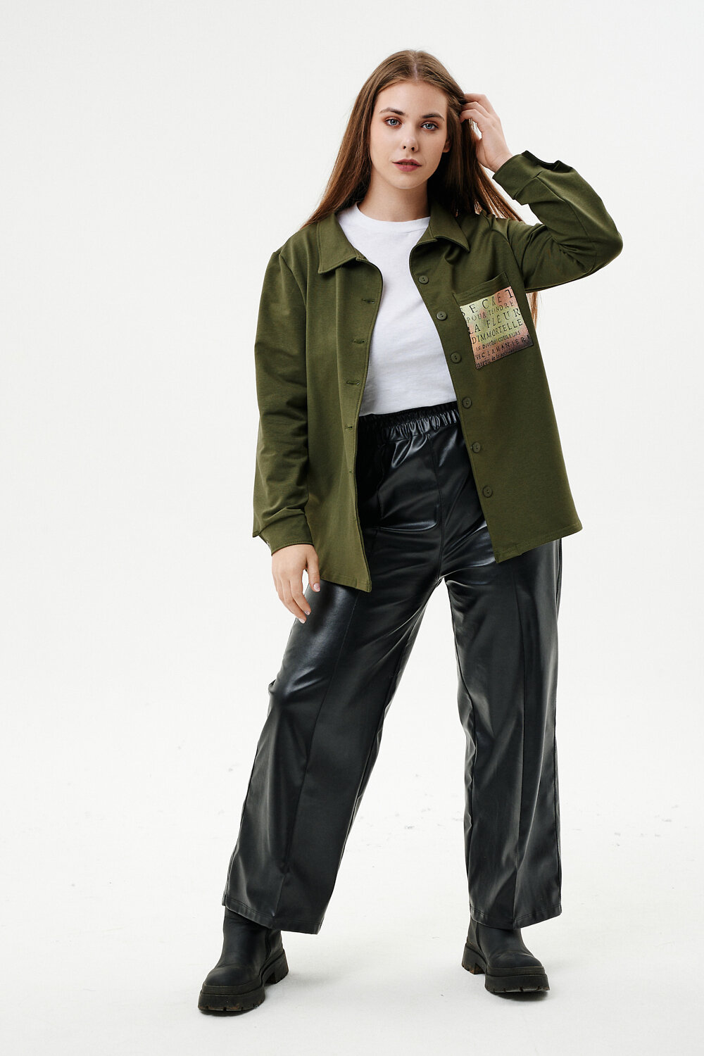 Туника женская прямого силуэта. Воротник отложной. Застежка на петли-пуговицы. Низ фигурный. Рукав втачной с манжетою. На левой части полочки нагрудный карман. Стилизованный принт в верхней части спинки, под воротником и на нагрудном кармане.