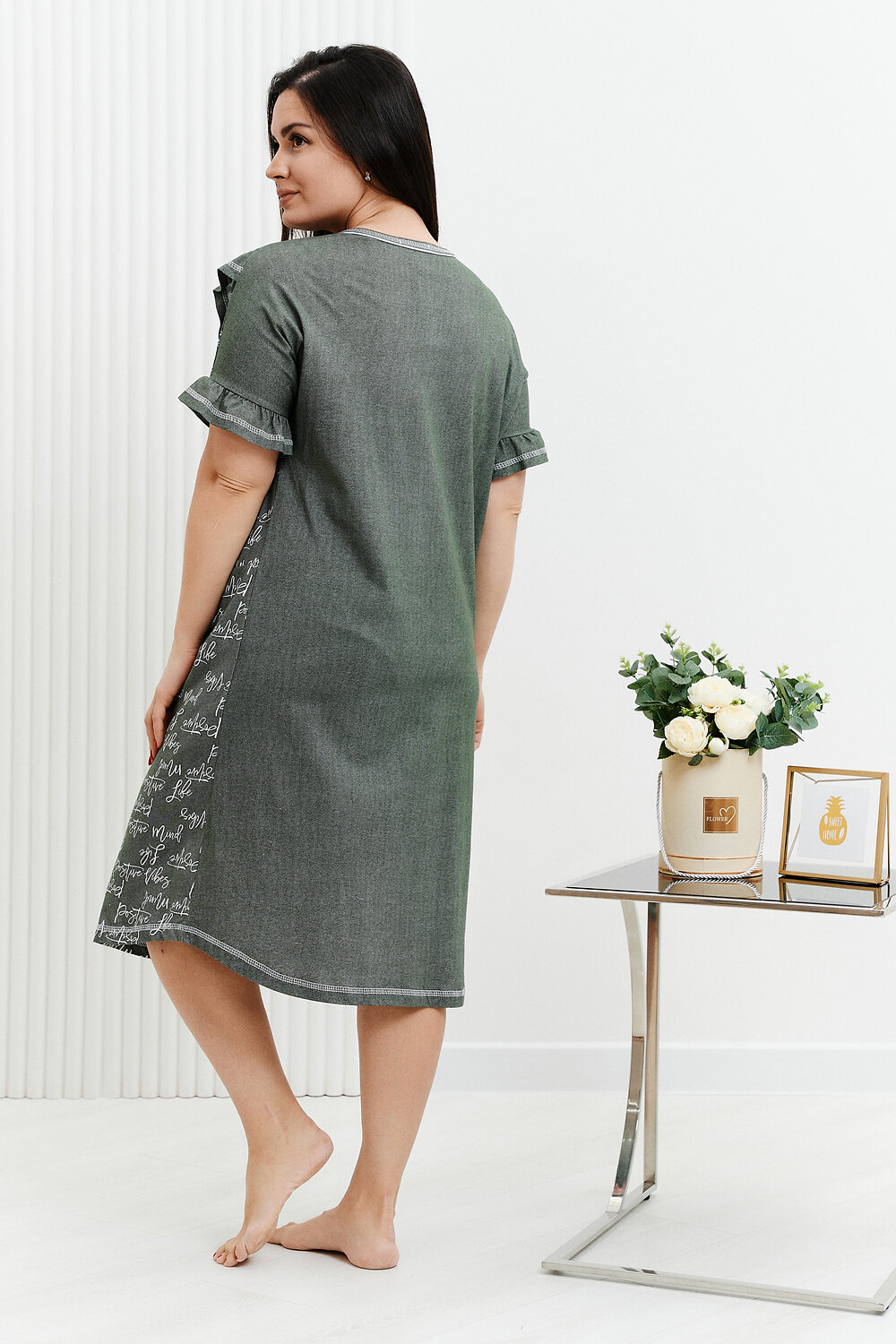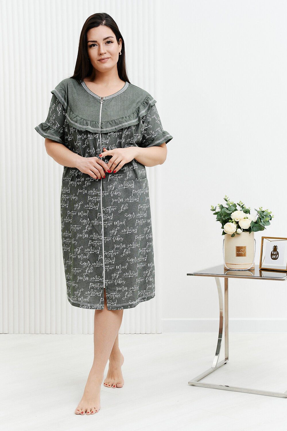 Халат женский, полуприлегающего силуэта, горловина округлая, застежка на тесьму-молнию. На полочке кокетка с рюшей, также рюша внизу цельнокроенного короткого рукава из отделочной ткани. Внутренние горизонтальные карманы в шве стачивания верхней и нижней части полочки.