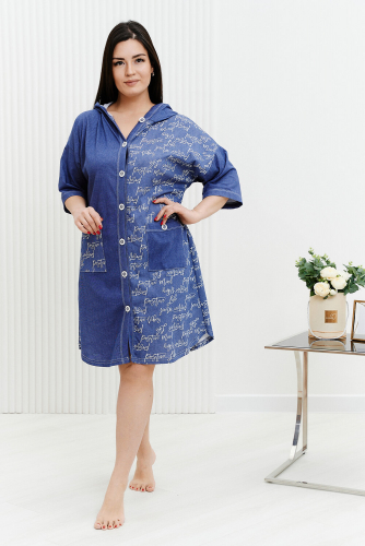 Халат женский, полуприлегающий, слегка расширенный к низу, с капюшоном. Застежка на петли-пуговицы. На полочке два накладных кармана. На спинке кокетка, и складка, которая придает изделию дополнительную свободу движения. Использование двух тканей-компаньонов придает изделию особую актуальность.
