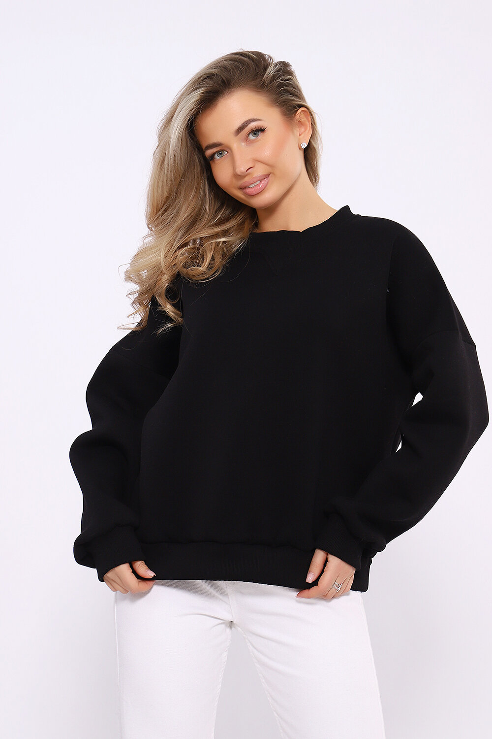 Свитшот из футера с начесом свободного кроя с длинными рукавами на манжетах и фигурным воротником.