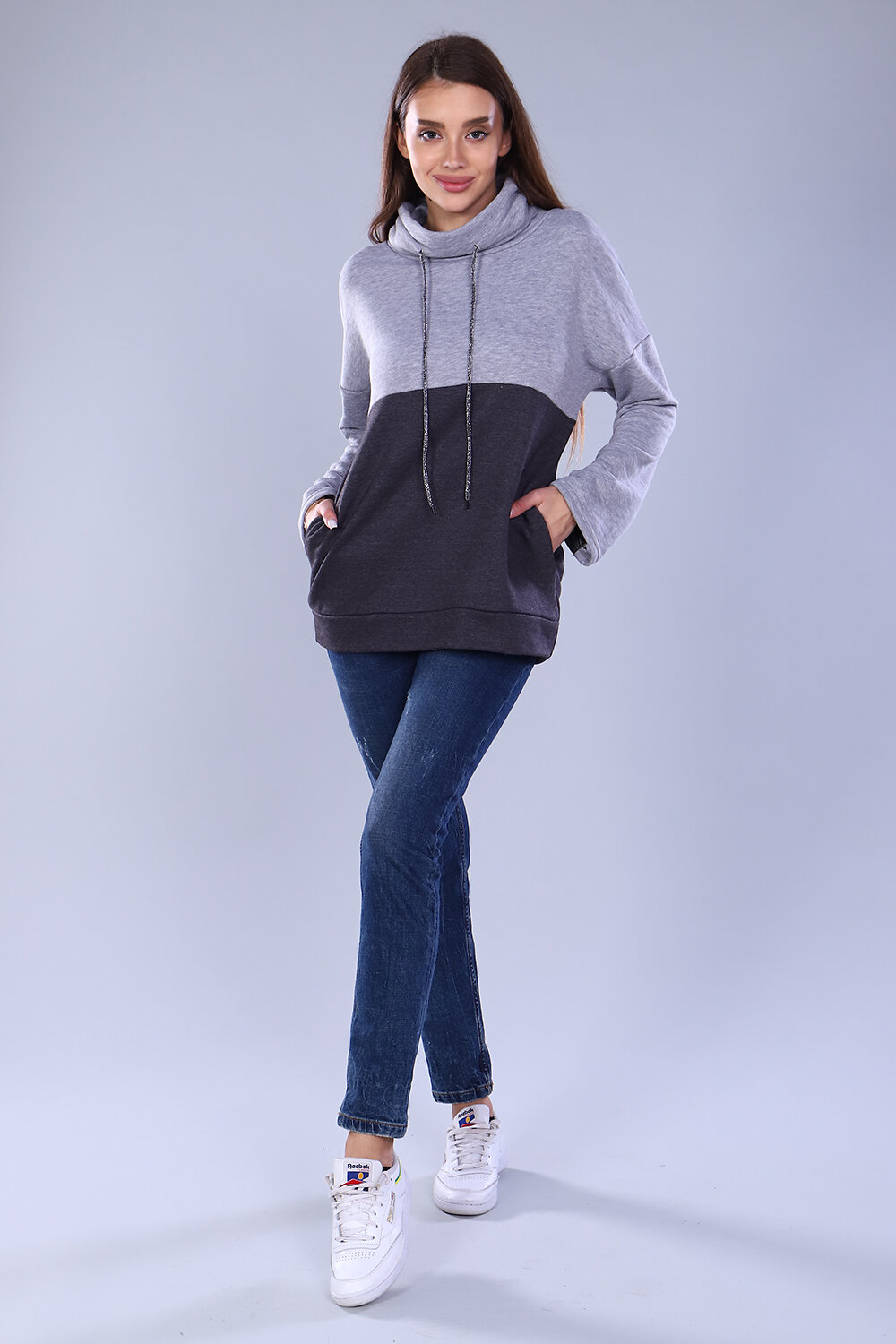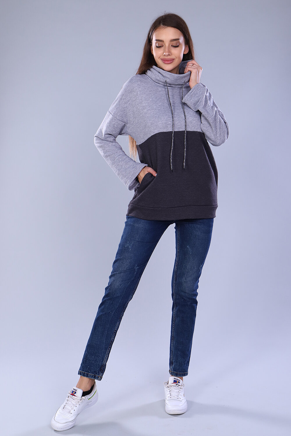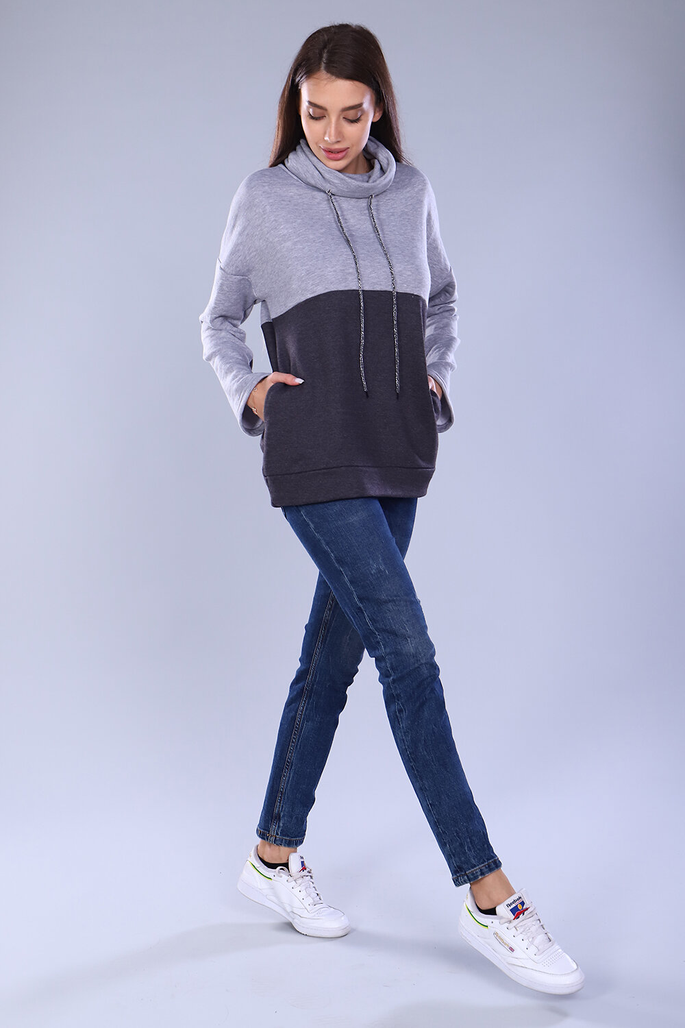 Туника женская с интересным и оригинальным свободным кроем из комбинированного футера 3-х нитка петля качества пенье. Модель удлиненная, линия плеча спущена, длинный рукав декорирован вставкой из компаньона, низ на манжете из основной ткани, в боковых швах удобные карманы. Цельнокроенный хомут со шнуром с металлизированными нитями люрекса прекрасно драпируется и помогает создать несколько интересных вариантов для вашего неповторимого образа. Эта туника для тех, кто ценит стиль и удобство. Вы непременно будете выглядеть модно, смело, интересно!