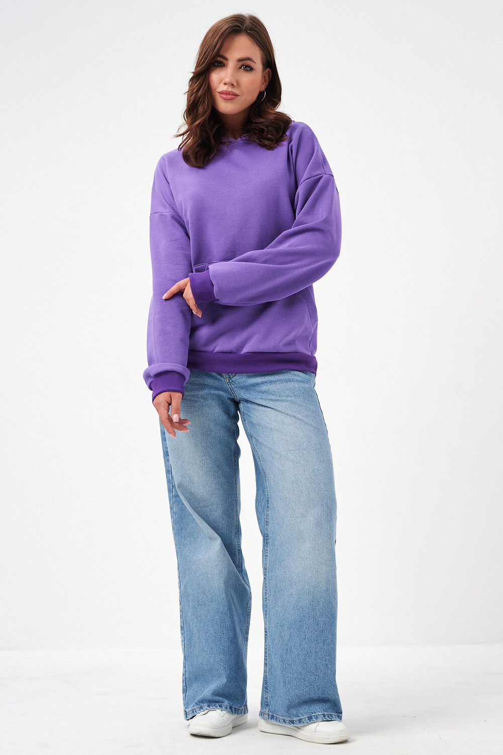 свободная толстовка с спущенной линией плеча, и накладным карманом-кенгуру. Изготовлена из хлопкового трикотажа футера 2-х нитки без начёса.