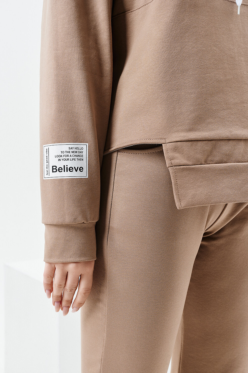 Толстовка прямая, свободная, с капюшоном, с фигурной линией низа на полочке. Рукав длинный, на манжете. На полочке расположен асимметричный карман кенгуру.