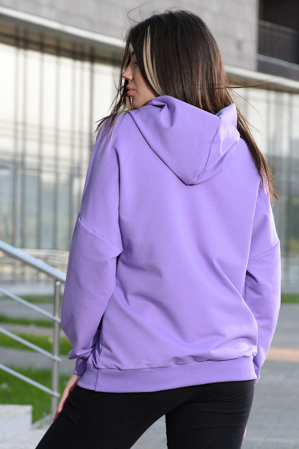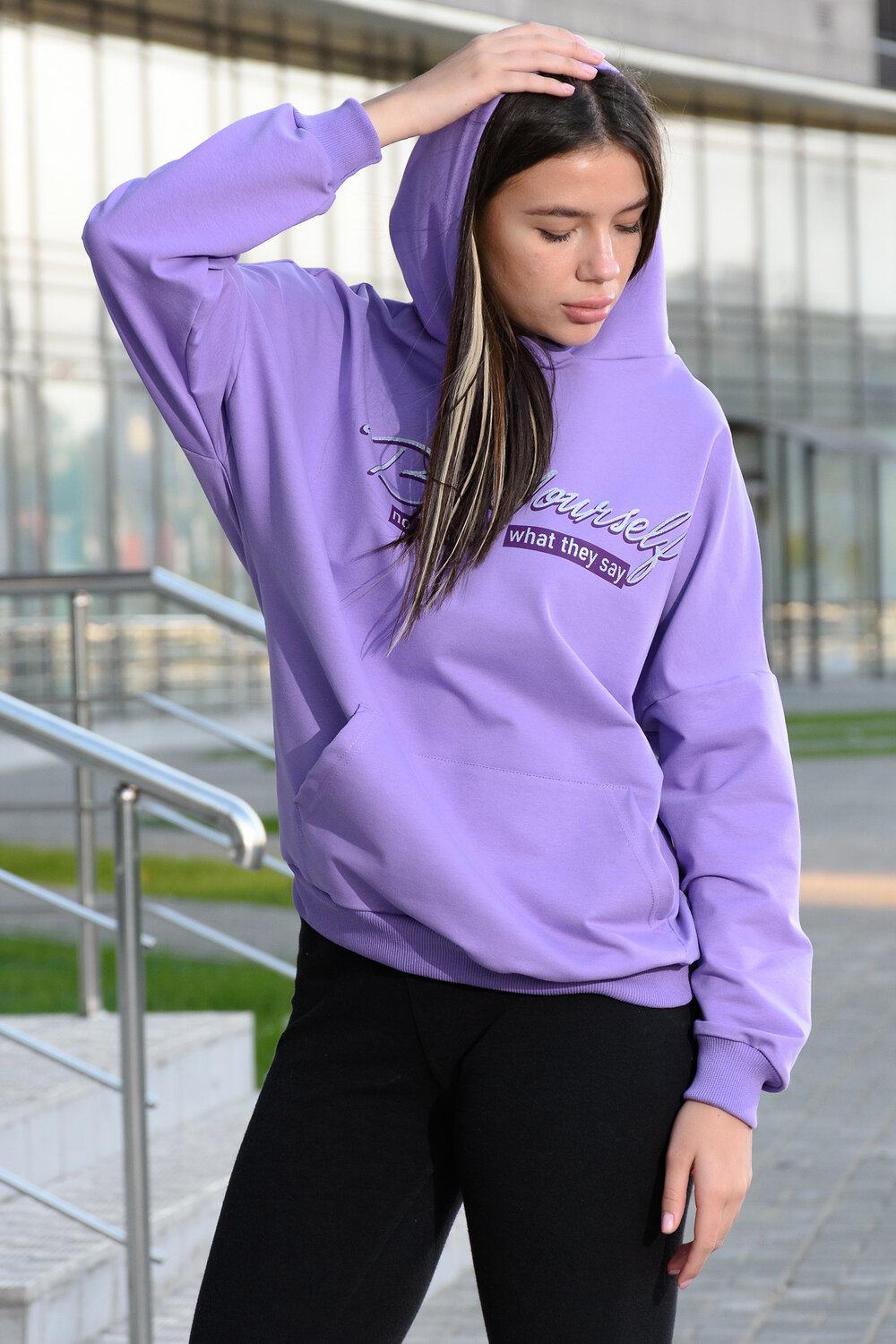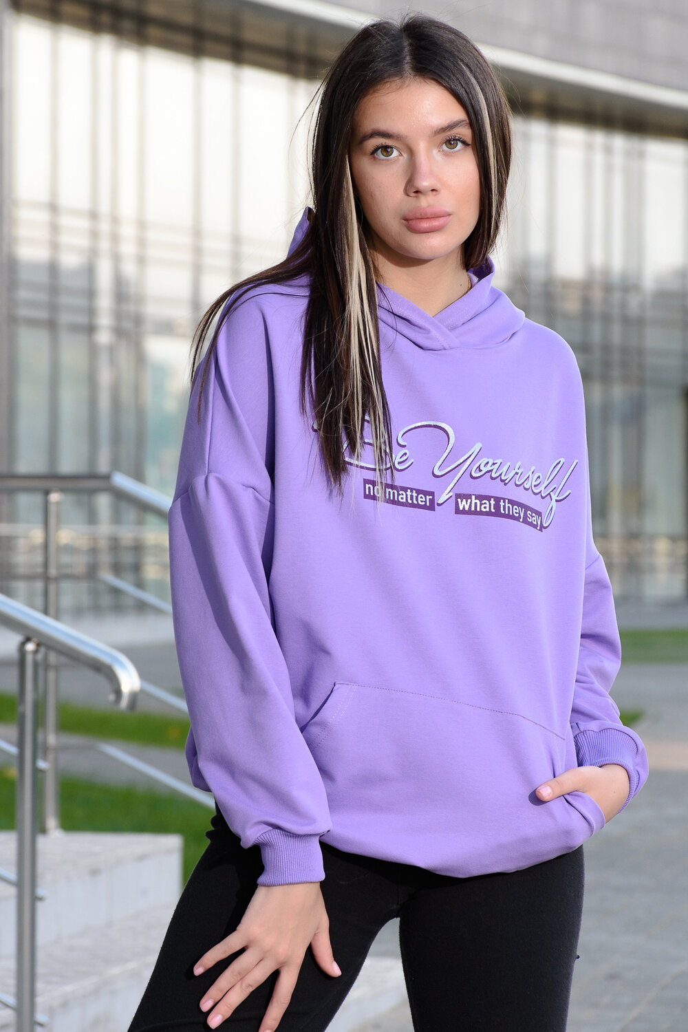 Фиолетовая мода. Слегка удлинённая толстовка в спортивном стиле с карманом кенгуру и капюшоном. Изделие выполнено из футера без начёса. Перевод текста:Будь самим собой и не важно что о тебе говорят. Линия плеча спущена, рукава удлинённые. В измерениях длина рукава указана от шва втачивания капюшона. Манжеты и низ толстовки обработаны плотной резинкой кашкорсе.