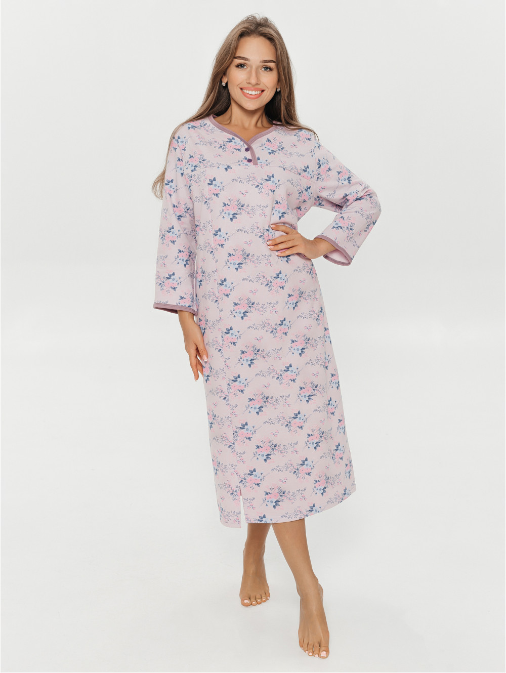 Во сне мы проводим почти половину жизни. Поэтому мы хотим, чтобы наш сон был по-настоящему сладким. Представляем Вам нашу сорочку с рукавом 3 /4 НЕЖЕНКА. Выполненная из футера с начесом, она прекрасно подойдёт девушкам и женщинам разного возраста для сна и отдыха, а также согреет Вас своим теплом в холодные дни. Простота кроя порадует Вас удобством. Фигурный вырез горловины формируют 2 отрезные кокетки с пуговицами. На полочке сорочки рельеф, переходящий в разрез. Желаем Вам приятных сновидений. Футер является натуральной тканью: он изготавливается из хлопка. Благодаря этому, ткань позволяет коже "дышать", великолепно сохраняя при этом тепло. Футер хорошо впитывает влагу и при этом остается гипоаллергенным.