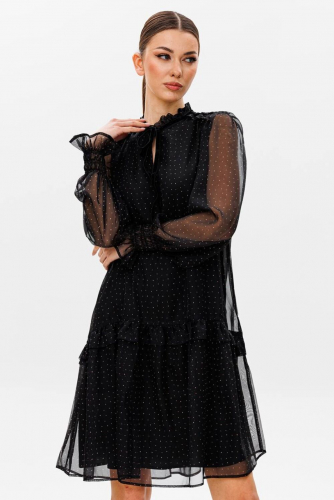 Блузка прямого силуэта, выполнена из крэш-полотна. Модель без воротника, без плечевых накладок, со спущенной линией плеча. Блузка отрезная по линии талии, в шве обработана кулиса с пояском из основной ткани. Перед с центральной застежкой по отрезным планкам на 5 петель и 5 пуговиц. Круглая горловина спинки обработана отрезной фигурной бейкой. Рукав длиной ¾, со сборкой вдоль притачной манжеты; для регулирования длины рукава внутрь манжеты протянута широкая эластичная лента, зафиксированная посередине отделочной строчкой. Над швом втачивания рукава заутюжена складка шириной 2 см и закреплена отделочной строчкой. Длина блузки – 60 см; длина рукава (от горловины) –59 см (44-46 р-р), 60 см (48-52 р-р).