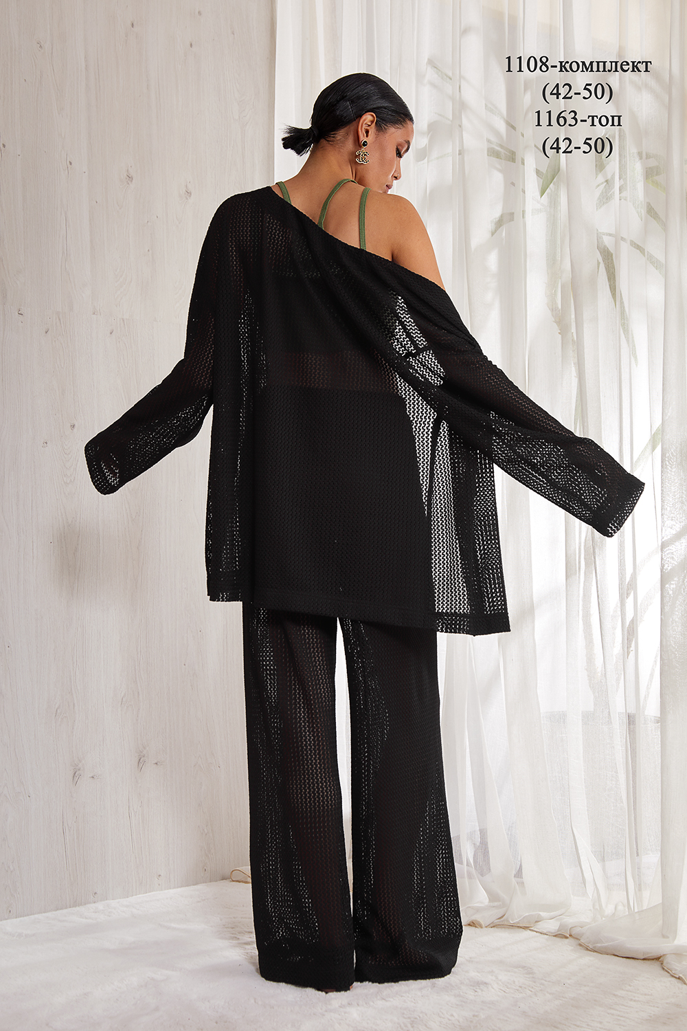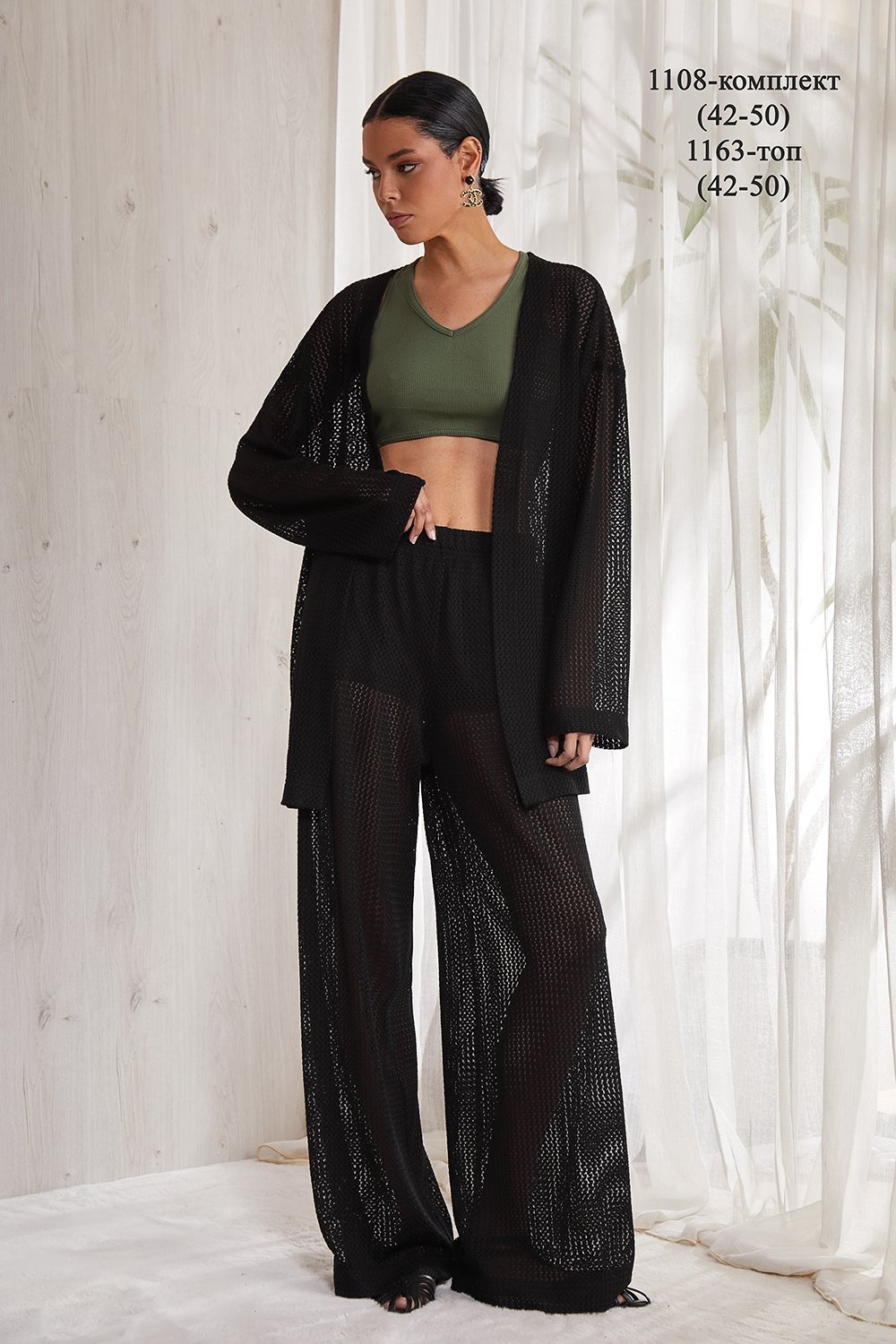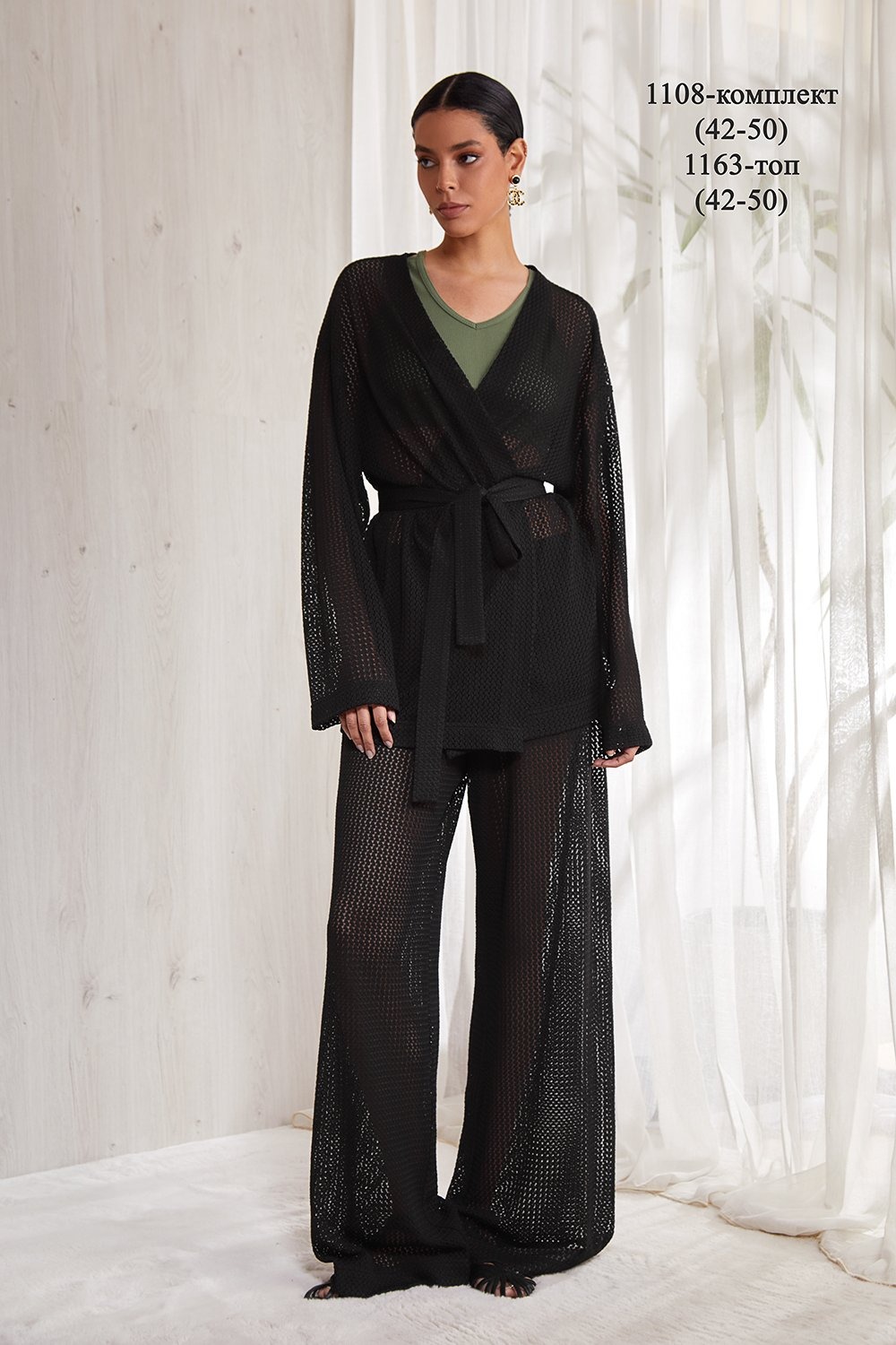 Костюм, состоящий из брюк и кардигана. Кардиган прямого силуэта, длиной до бедер. Изделие без застежки и без воротника. Спущенная линия плеча. Свободный длинный рукав, немного расширенный книзу. Спинка прямая. Изделие без подкладки. Пояс идет в комлекте. Брюки прямые, свободного кроя. Брюки на резинке (без застежки). Карманы в боковых швах .В брюках есть подкладка в виде коротких шортиков.