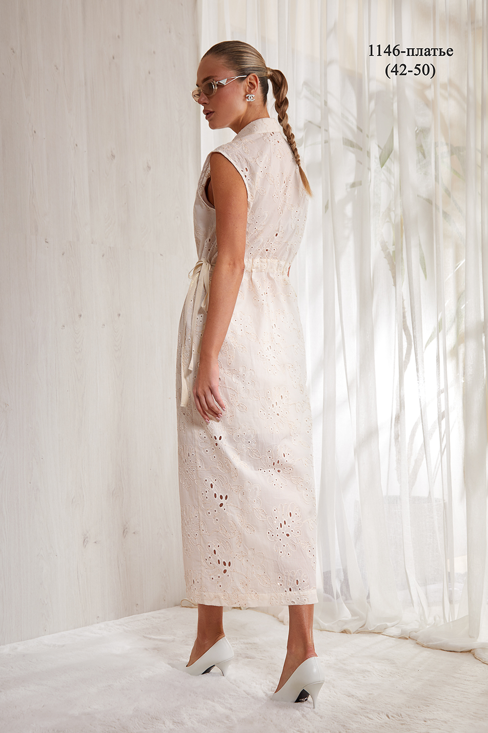 Платье прямого силуэта, выполнено из тонкого кружевного фактурного хлопка. Длина маxi. Центральная застежка на петли и пуговицы. Застежка доверху. Спинка прямая. По талии декоративная кулиса, в которую вставлена хлопковая тесьма. Изделие регулируется по линии талии. Спущенное плечо. Воротник рубашечный. Изделие частично на подкладке.