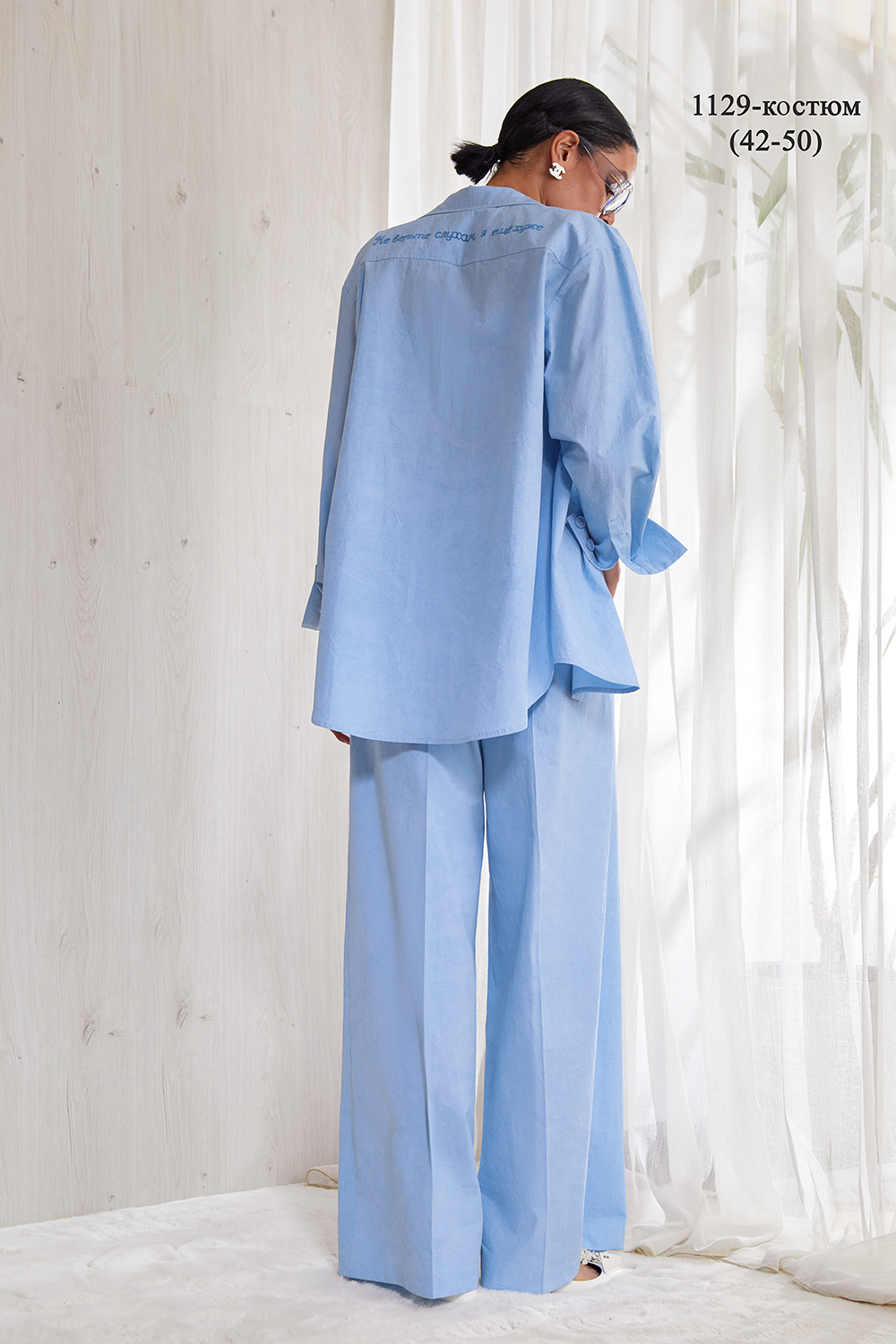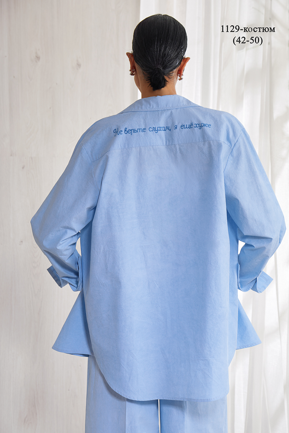 Костюм, состоящий из стильной удлиненной рубашки и брюк.