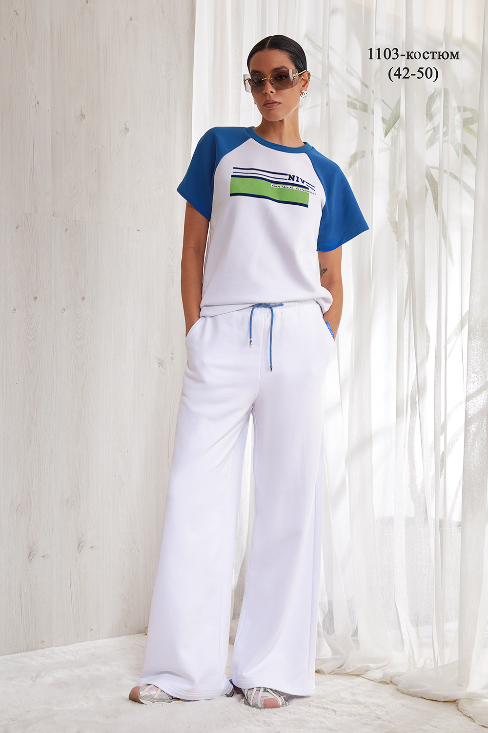 Костюм выполнен из премиального трикотажного полотна, состоящий из футболки и брюк. Футболка прямого силуэта, перед и спинка изделия прямые, рукав реглан. Горловина круглая с притачной планкой из отделочной ткани. Рукав также выполнен из отделочной ткани. Брюки прямые, свободные, пояс на резинке. Карманы в боковых швах. Сзади на брюках накладные карманы. По поясу вставлен декоративный шнурок. В области кармана –дизайнерский флажок. На полочке футболки и на заднем кармане брюк - авторская печать.
