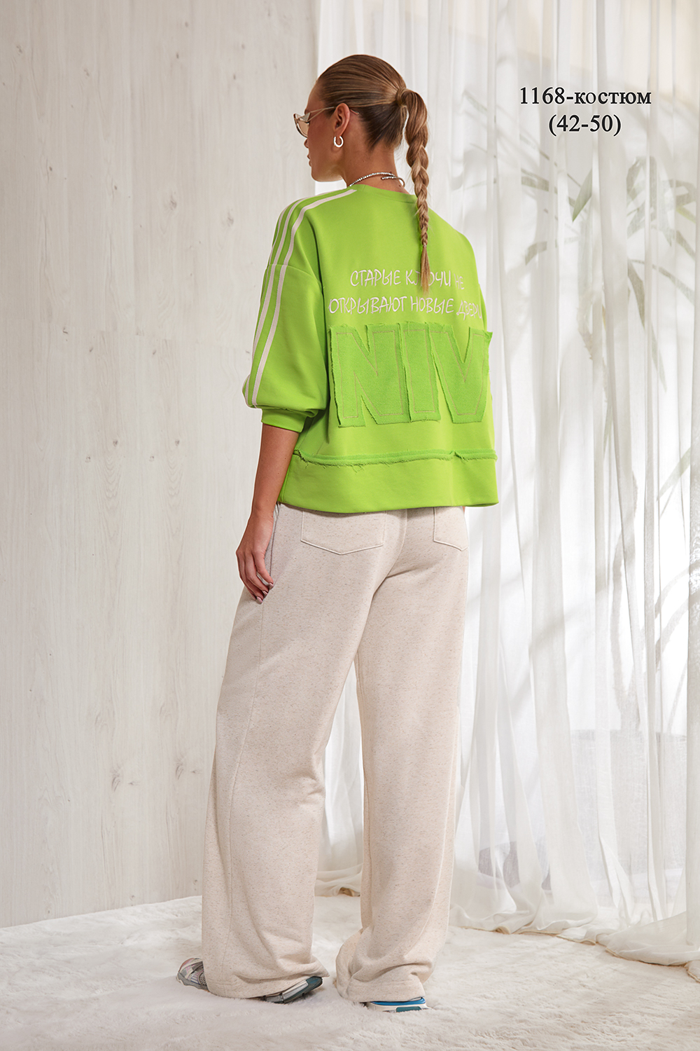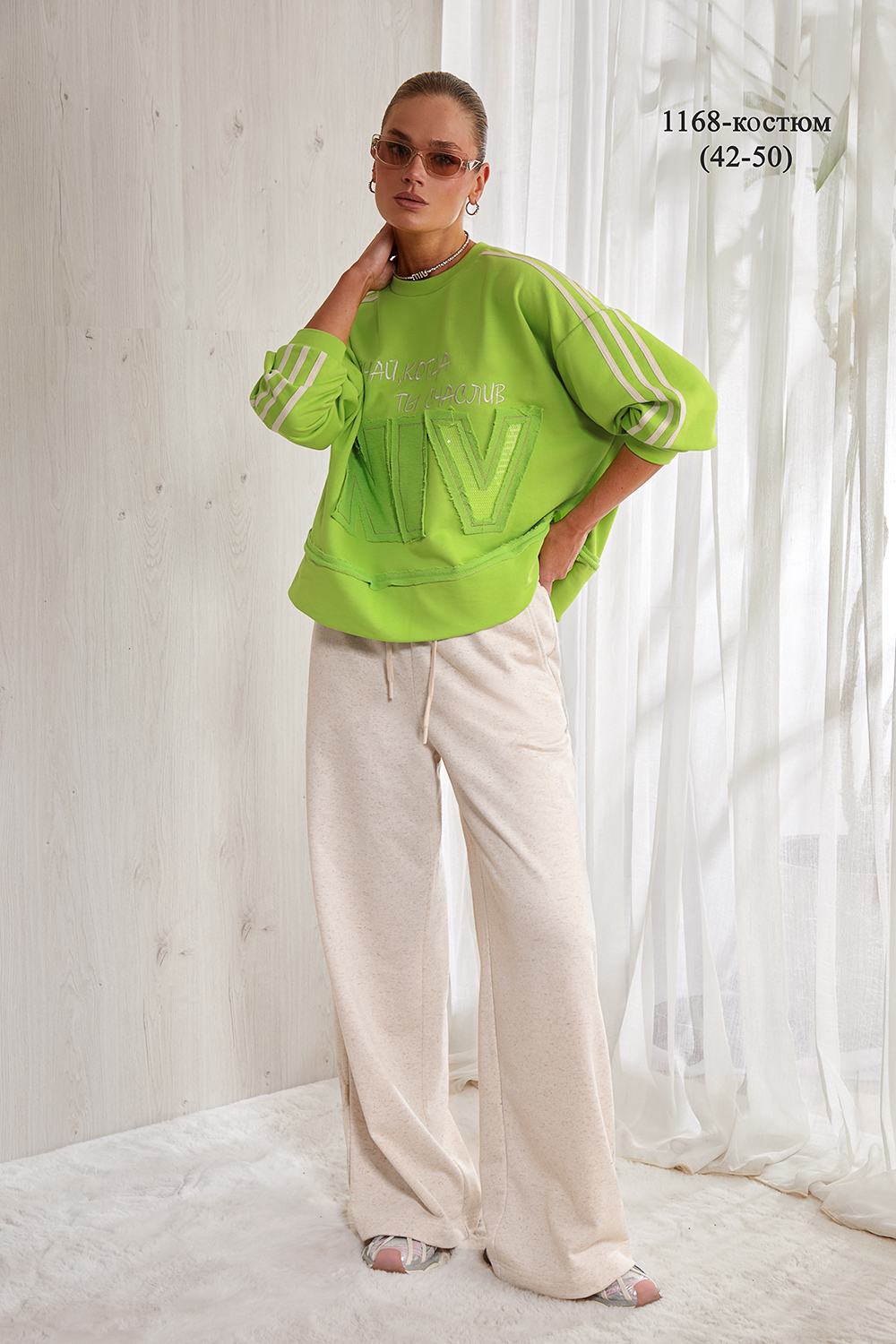 Костюм, выполнен из премиального трикотажного полотна, состоящий из свитшота и брюк. Свитшот прямого силуэта, перед и спинка изделия прямые. Спущенная линия плеча. Объемный длинный рукав. Низ рукава на притачной манжете из отделочной ткани. Горловина круглая, на притачной планке из отделочной ткани. По линии плеча настрочена декоративная тесьма. Брюки прямые, свободные. Пояс на резинке. По поясу вставлен декоративный шнурок. Карманы в боковых швах. На задних половинках брюк - накладные карманы. Авторская вышивка на полочке и на спинке свитшота.