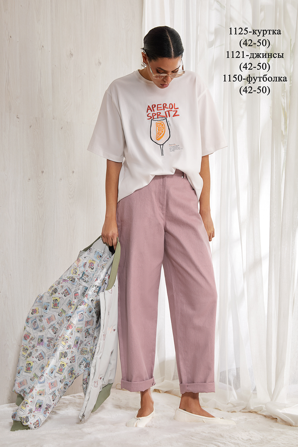 Объемная футболка оверсайз выполнена из плотного хлопкового трикотажного полотна (интерлок). Спущенная линия плеча. Рукав до локтя.. Горловина круглая с притачной планкой. Дизайнерский принт “APEROL” на передней половинке футболки.