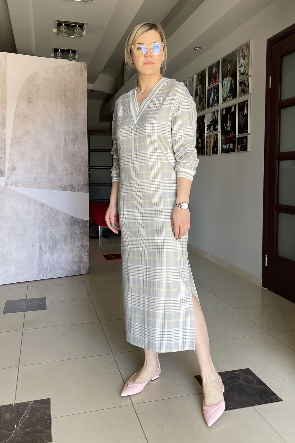 Платье прямого кроя, спинка выполнена из однотонного серого полотна.