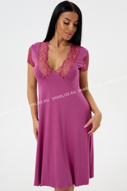 Сорочка из вискозы, брусничного оттенка с v-образным вырезом и маленьким кружевным рукавом.